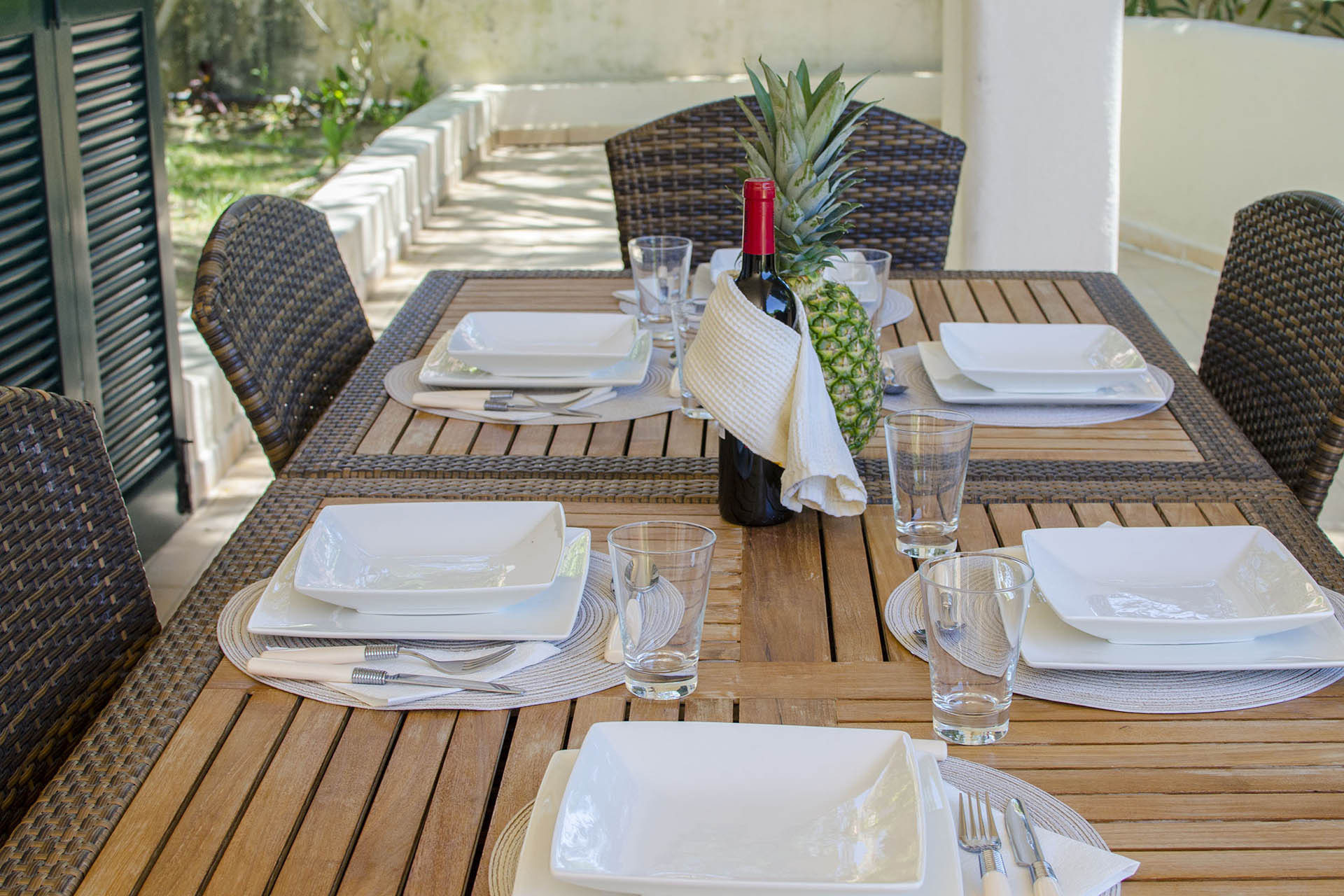O exterior dispõe de área de B.B.Q a carvão e mesa para 8 pessoas, que lhe permitirá desfrutar de refeições ao ar livre nos dias quentes de Verão com toda a comodidade.