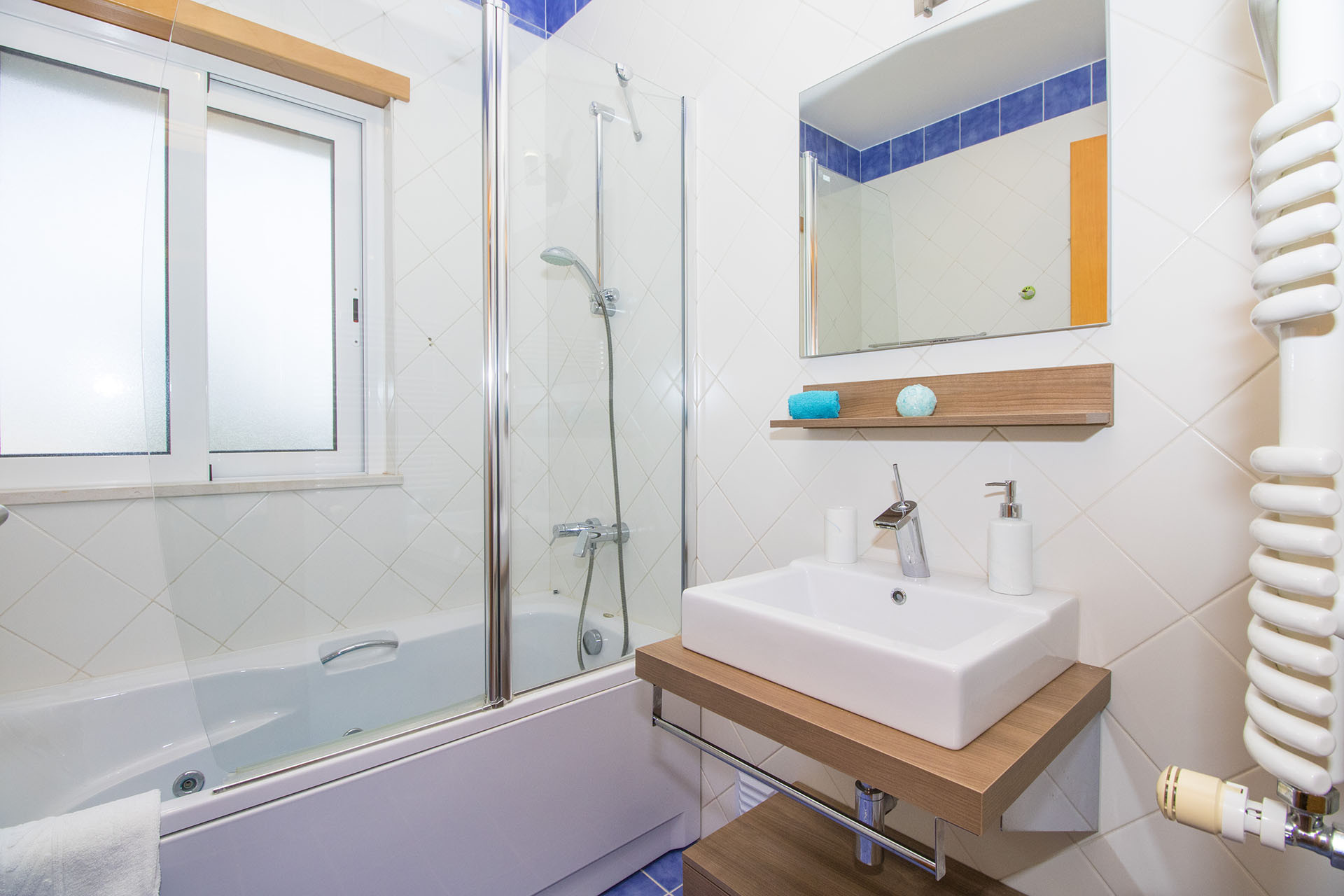 No rés-do-chão existem 2 quartos. 1 quarto de casal e 1 quarto com 2 camas de solteiro, ambos decorados em agradáveis tons de branco, cinza e preto, num estilo moderno e confortável. A casa de banho do quarto de casal é ampla e possui banheira, a casa de banho do quarto de solteiro oferece um chuveiro com coluna de hidromassagem.