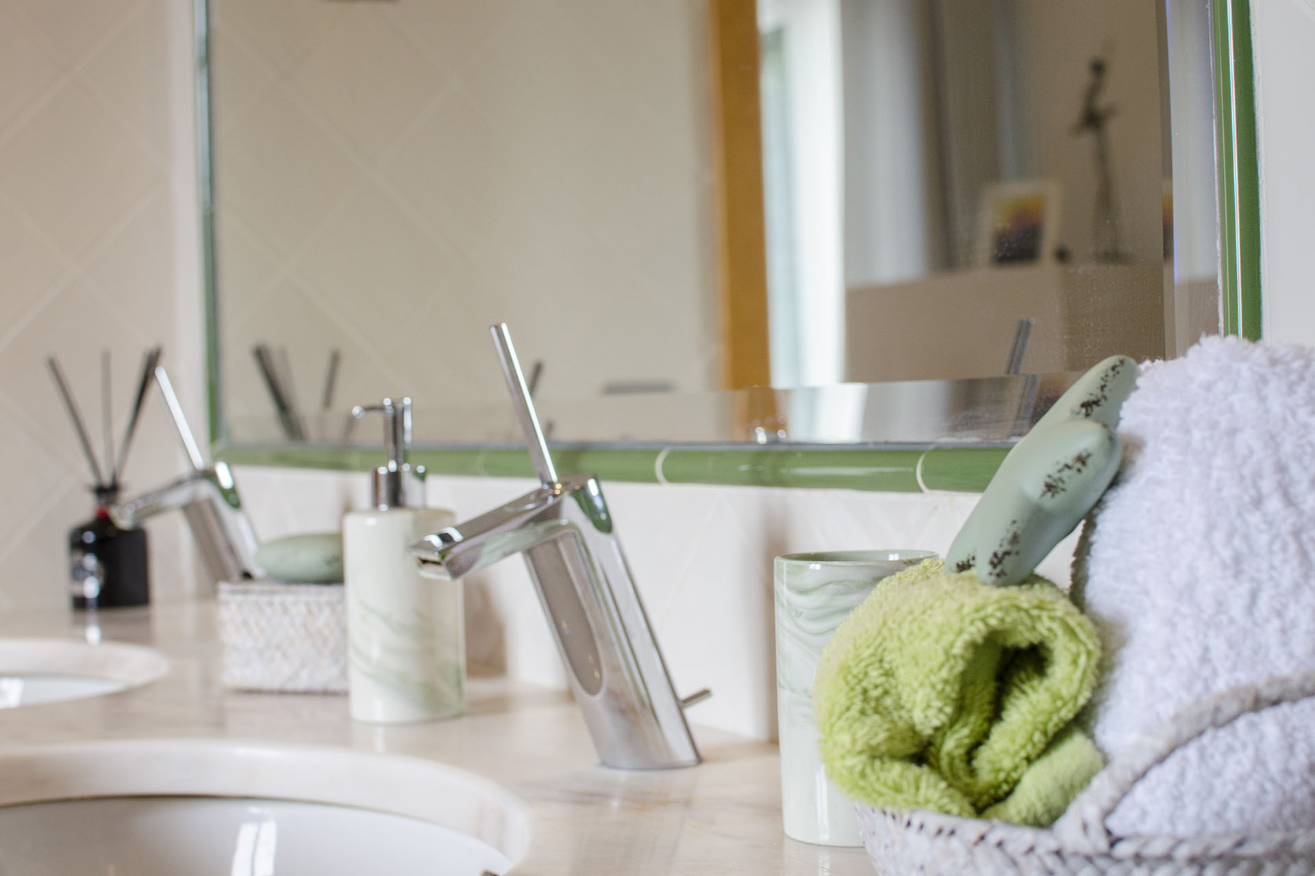 No primeiro andar existem 3 quartos. Um quarto com cama de casal, decorado em tons de branco e dourado, e dois quartos com duas camas de solteiro cada, um em tons de castanho e beje e outro em tons de branco e bordeaux. Todas as casas de banho são amplas e possuem banheira com jacuzzi. O quarto individual em tons de castanho, possui um pequeno terraço, no qual pode disfrutar os primeiros raios de sol e apreciar a magnifica vista sobre a quinta do mar.
