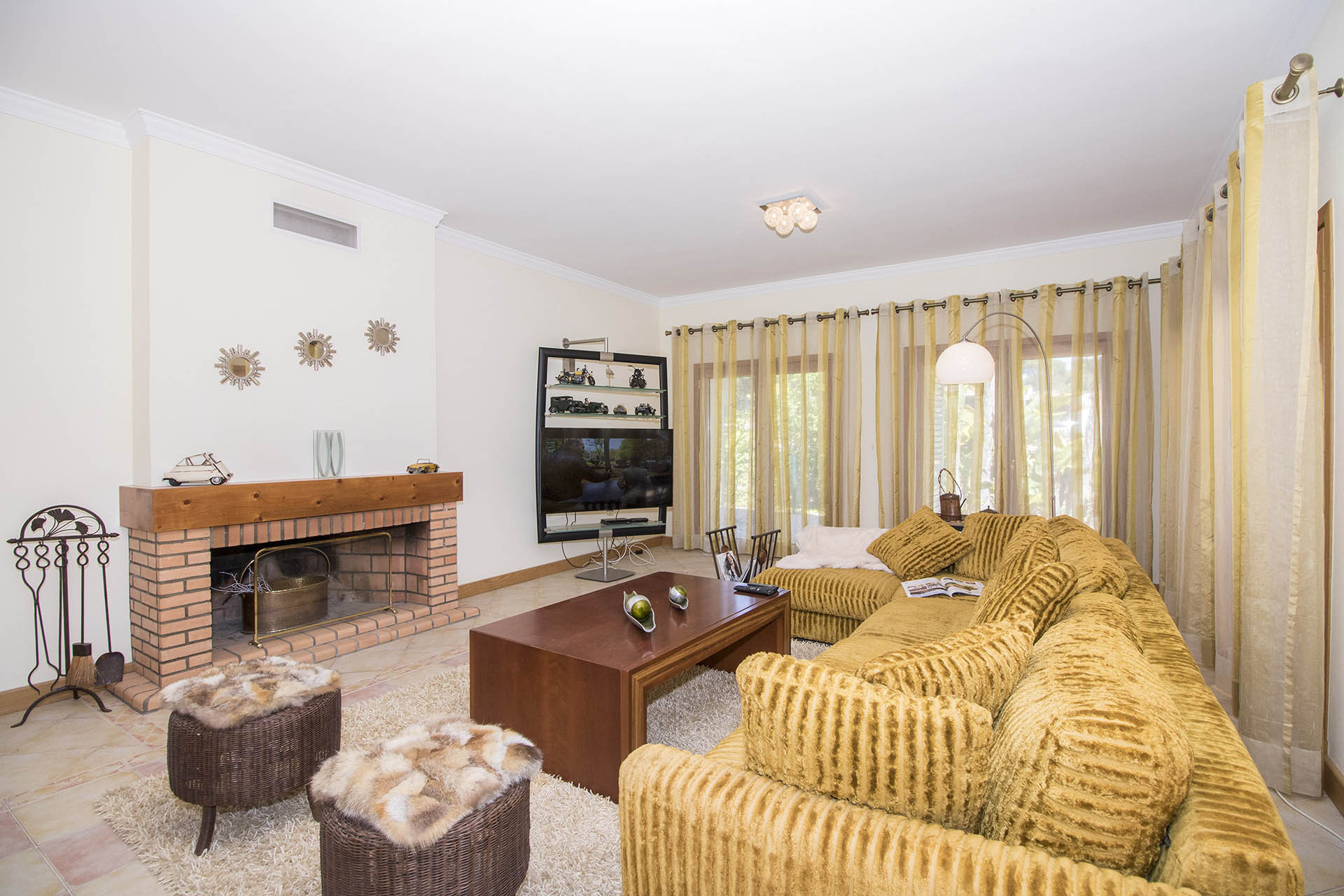 A sala é ampla e luminosa e conta com uma lareira que torna o espaço mais acolhedor nos dias de inverno.
