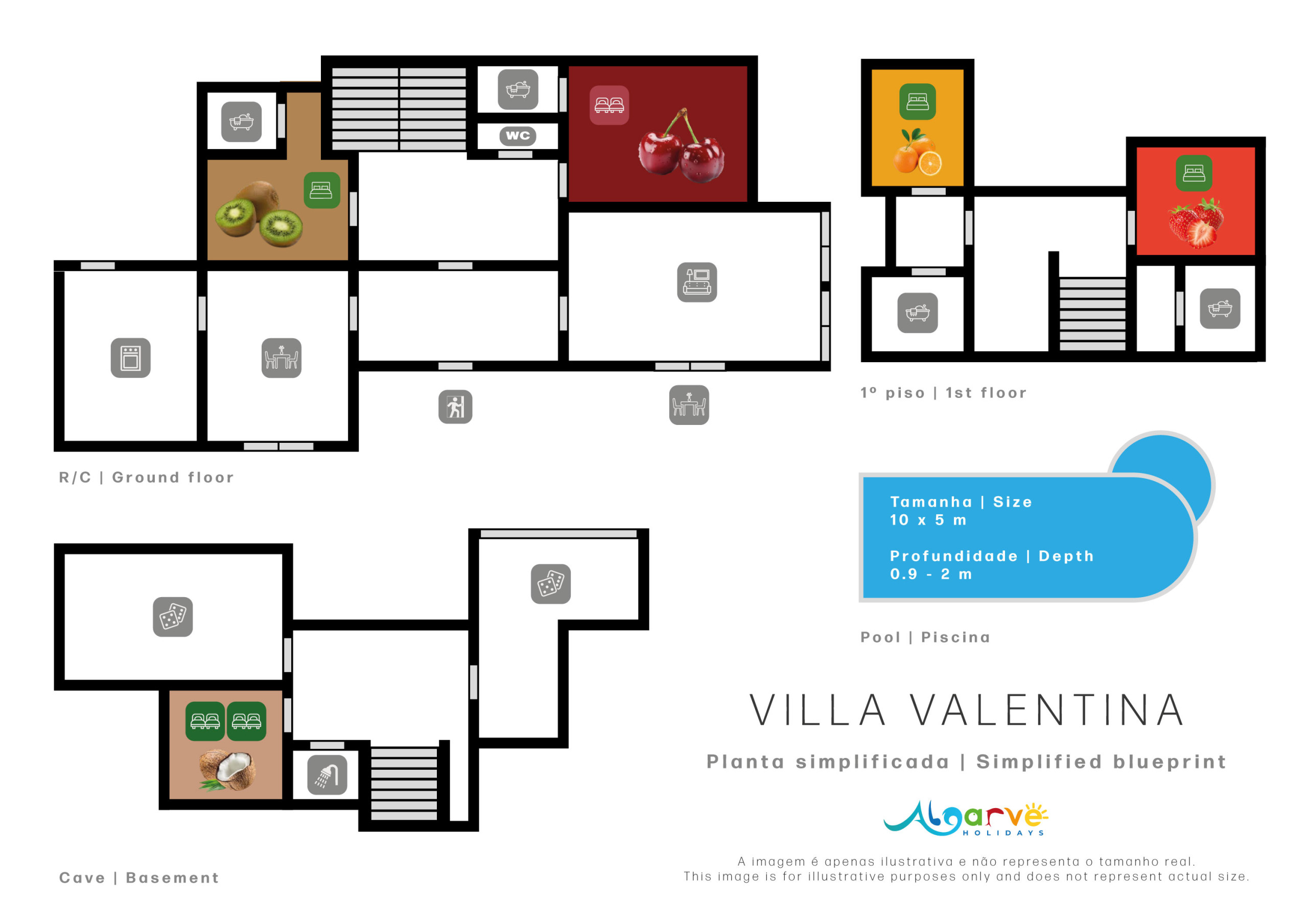 A Villa Valentina é a última casa da urbanização, o que oferece-lhe pouco movimento de automóveis, e está decorada para proporcionar tudo o que precisa para umas férias inesquecíveis em família. No total, oferece cinco quartos, seis casas de banho e 10 camas (mais sofá‑cama), acomodando até 14 pessoas. No rés do chão, encontra um quarto com cama superking e casa de banho privativa com banheira e duche, e um quarto com duas camas individuais e casa de banho privativa também com banheira e duche, ambos com ar condicionado. No primeiro andar, há um quarto com cama superking, TV e casa de banho privativa com banheira e coluna de duche, e outro quarto com cama king‑size e casa de banho privativa com banheira e duche, igualmente climatizados. No piso inferior, um quarto com quatro camas individuais e casa de banho com duche é perfeito para crianças ou amigos, enquanto um espaço acolhedor entre os quartos do primeiro andar tem um sofá‑cama para mais duas pessoas; no rés do chão existe ainda um WC extra.