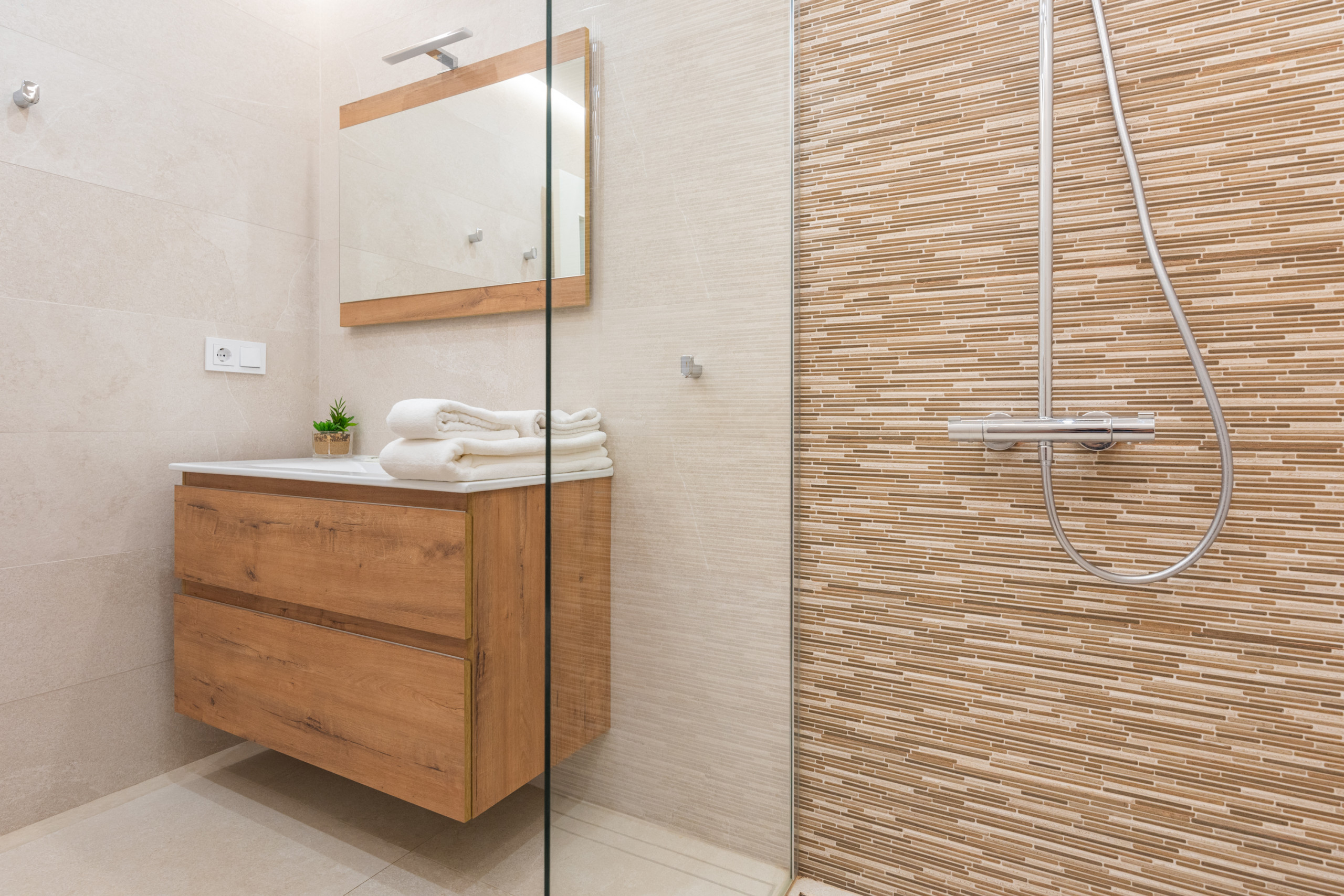 1 master bedroom with double bed, bathroom en-suite with extra large shower, wardrobe and air conditioning