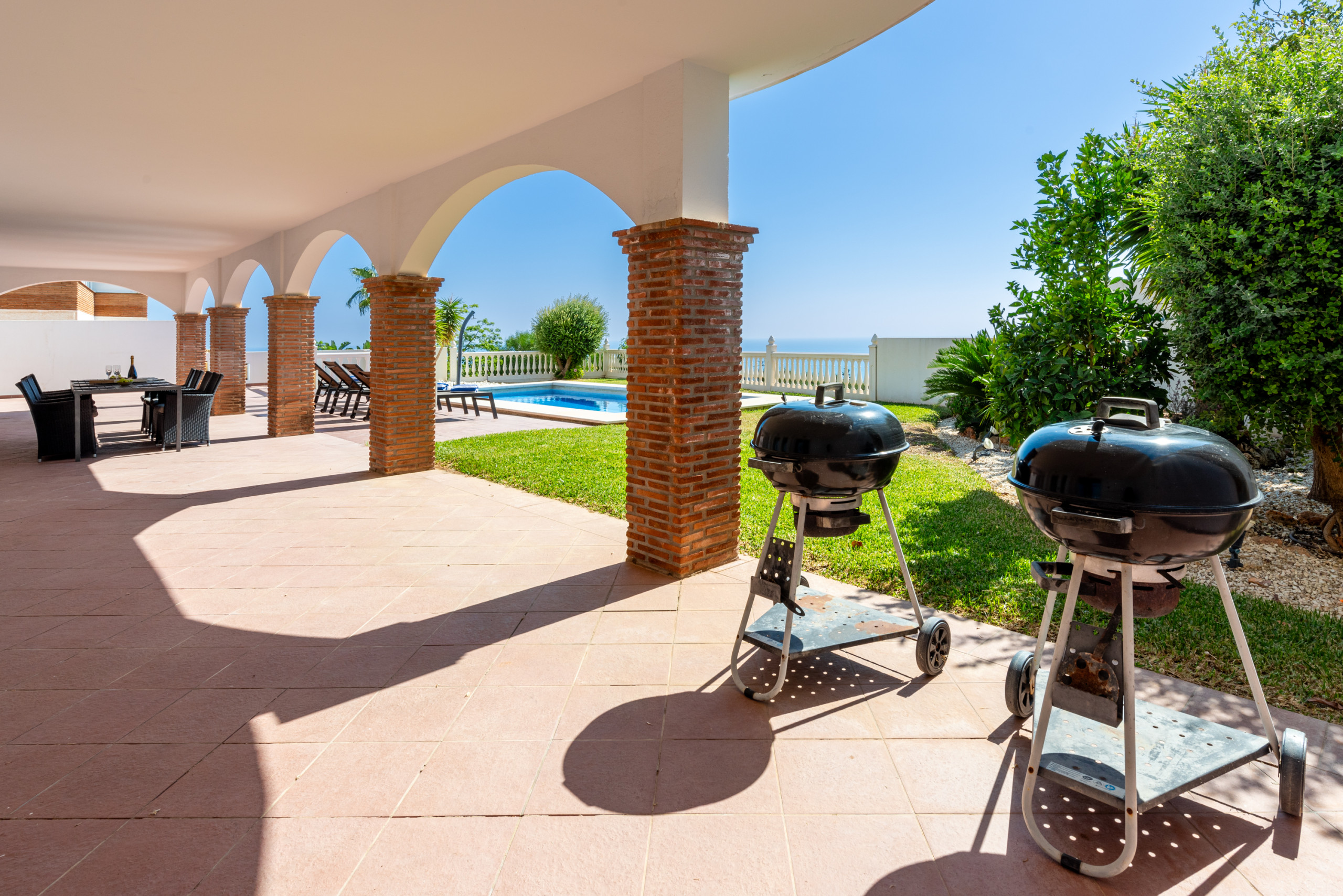 Between the main house and annex are the one of the 2 swimming pools. There are plenty of loungers and patio furniture so you can all dine together. Electric awnings. Beautiful views of Benalmadena and the Mediterranean.