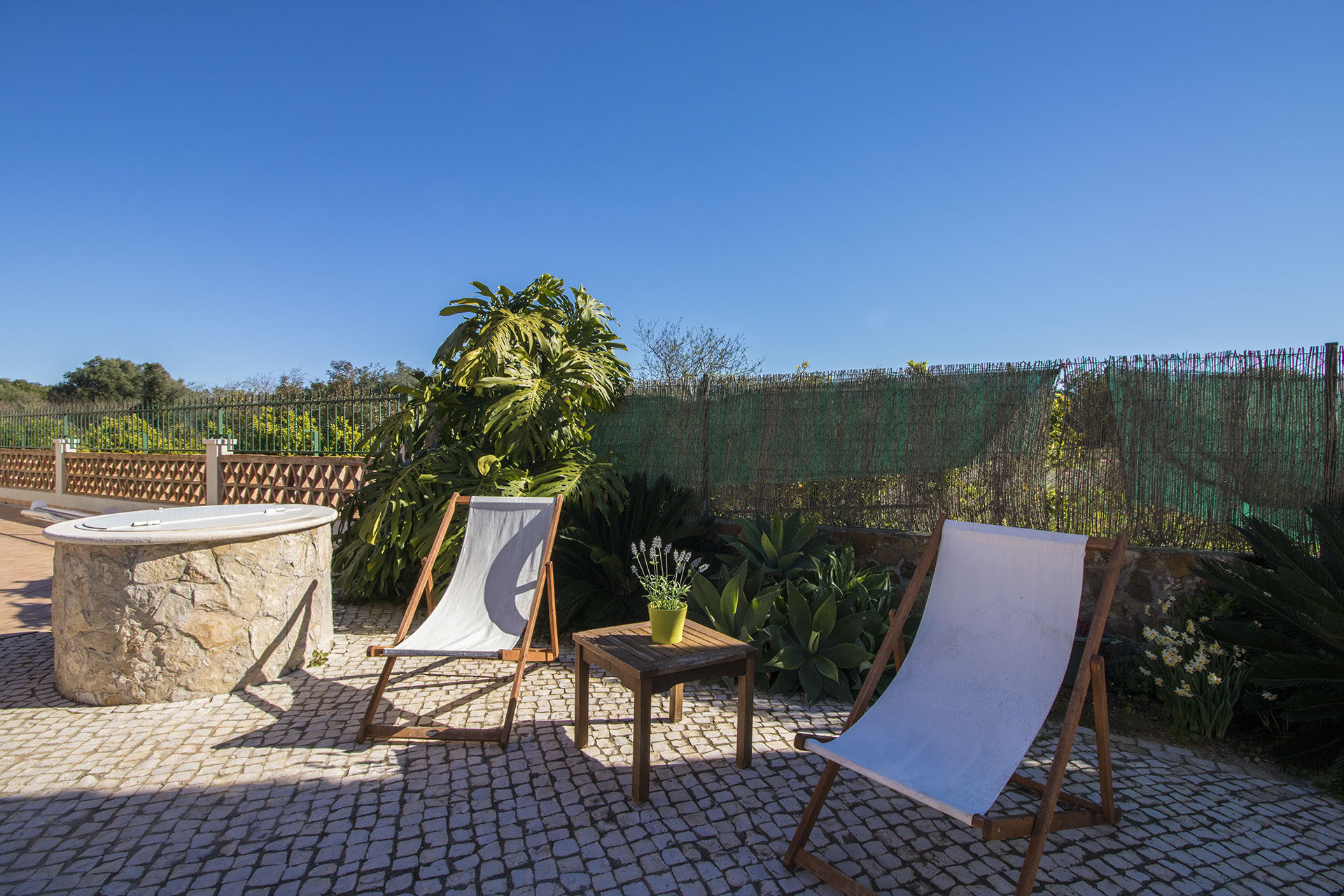 O exterior conta com uma piscina de aproximadamente 9 metros de comprimento e 4 metros de largura. A zona mais profunda apresenta 1,90 metros, sendo a zona mais rasa de de 1 metro. A piscina tem a possibilidade de ser aquecida somente entre Abril e Outubro, através de um custo adicional (com um pedido efetuado no mínimo com 48h de antecedência), Contudo se as temperaturas estiverem demasiadamente baixas, poderá não ser possível o fornecimento do serviço. Existe um espaço relvado com baloiço e outros brinquedos, beneficia da sombra natural das palmeiras e revela-se um local ideal para as crianças se divertirem. Mobiliário diverso de exterior torna o jardim um espaço relaxante e agradável para toda a família. Matraquilhos e ténis de mesa fazem as delícias dos nossos clientes.