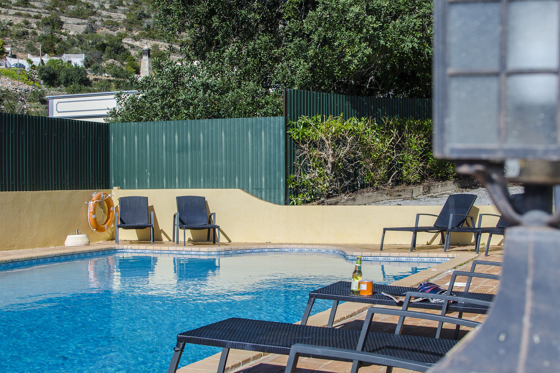 A zona de refeições no exterior conta com bastante mobiliário de exterior, próprio para 8 pessoas. A piscina de 10 metros de comprimento por 5 de largura. A piscina tem a possibilidade de ser aquecida somente entre Abril e Outubro, através de um custo adicional (com um pedido efetuado no mínimo com 48h de antecedência), contudo se as temperaturas estiverem demasiadamente baixas, poderá não ser possível o fornecimento do serviço. Ao seu redor tem várias espreguiçadeiras e uma área de lazer com dois sofás e uma mesa, ideal para tomar uma bebida em paz ou ler um livro.