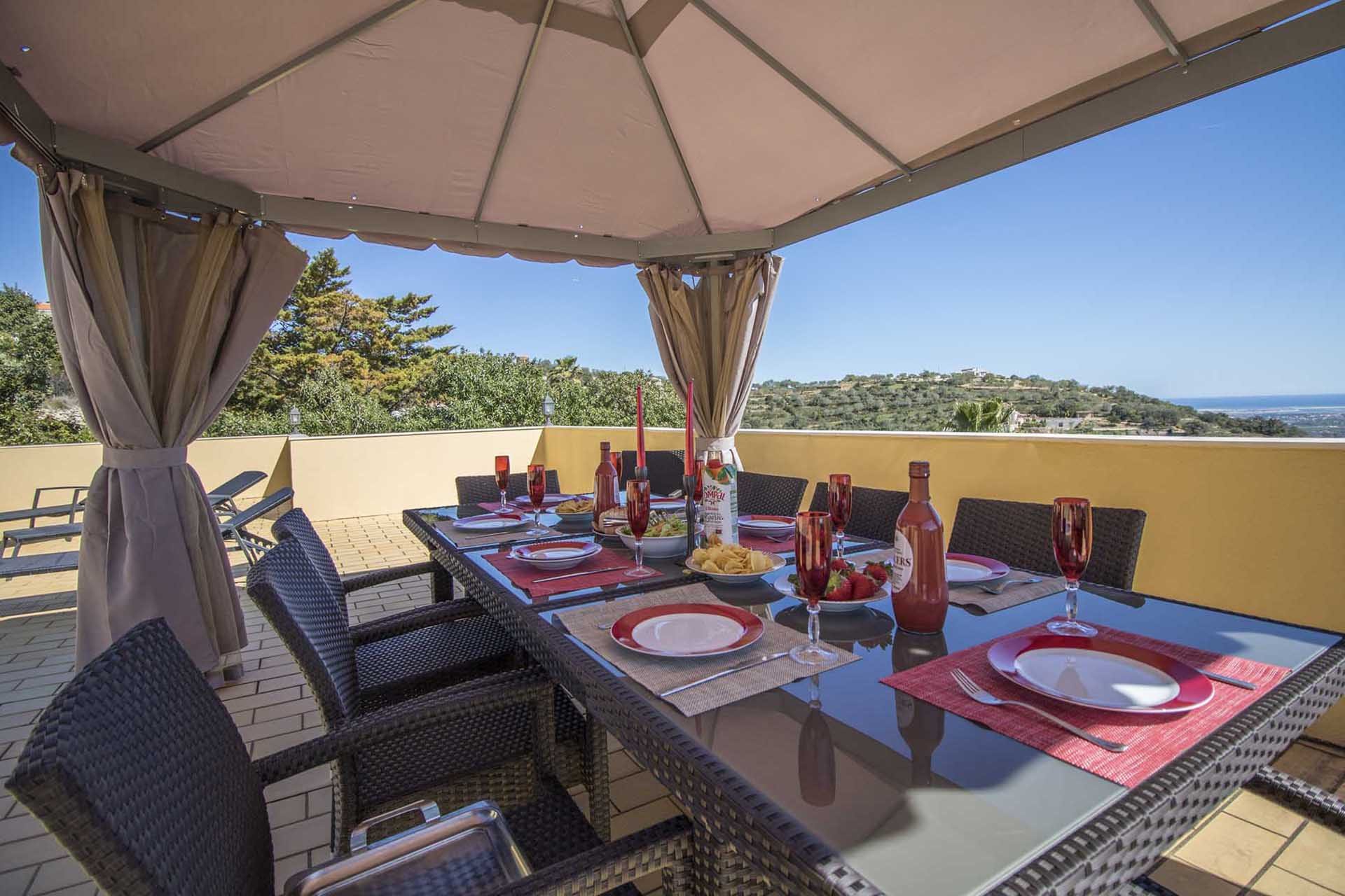 A zona frontal desta maravilhosa moradia é o ponto alto, e é impossível ficar indiferente á vista que percorre todo o horizonte, desde o mar ás ilhas e Ria Formosa. Uma pérgula reveste a mesa de exterior, onde é possível se sentarem 10 pessoas a contemplar o quadro de fundo sem moldura enquanto saboreiam a sua refeição ao ar livre. Ao lado, um confortável sofá faz todo o canto da parede.