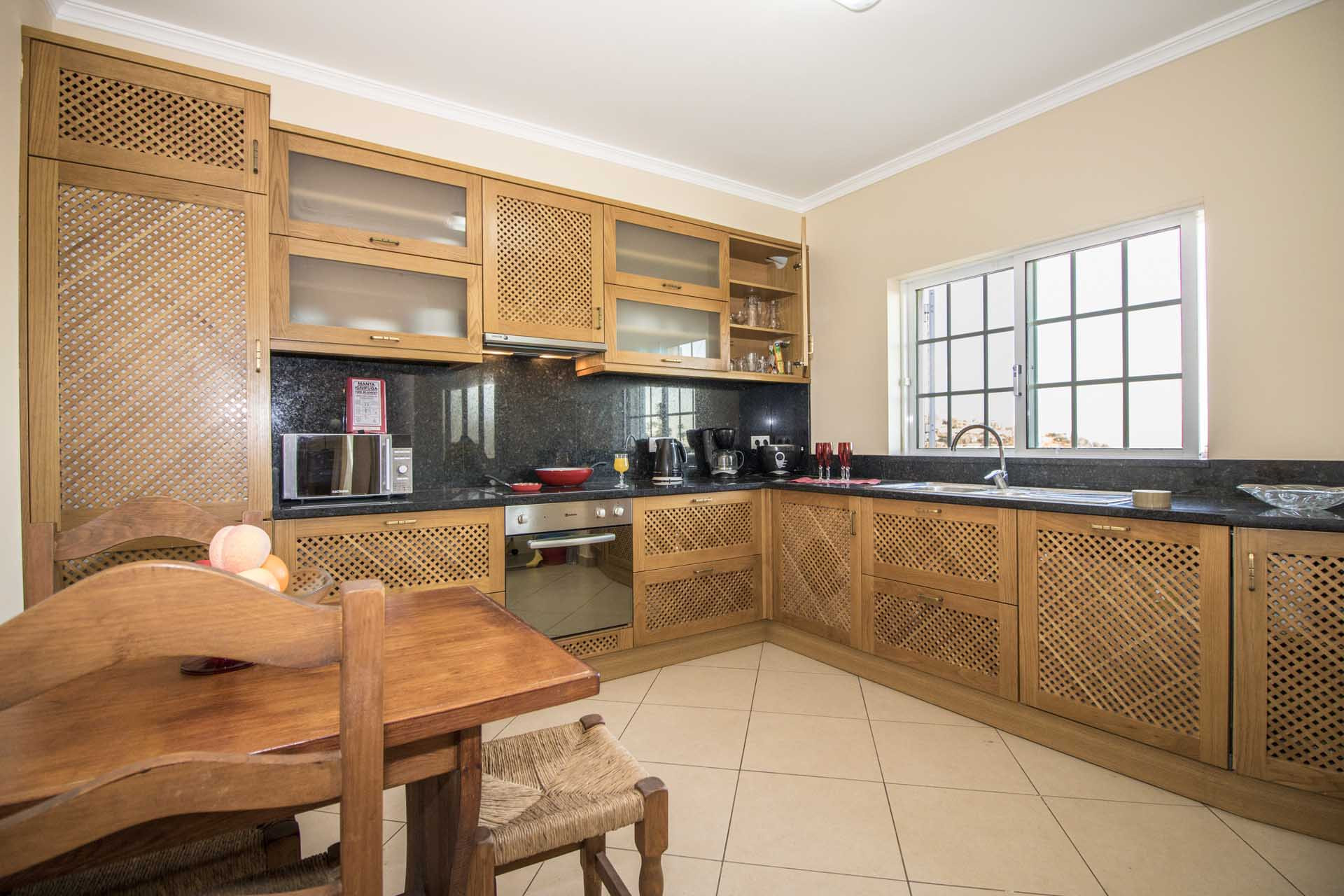 A cozinha é de espaço aberto para a sala e zona de refeições o que possibilita um maior contato com família e amigos. Uma janela deixa também vislumbrar a piscina e o oceano enquanto trabalha e até mesmo olhar os mais pequenos. Tem ainda uma porta que dá acesso ao exterior e ao BBQ. Os equipamentos são de fácil uso e toda ela está bem equipada com máquina de loiça, micro-ondas e todos os aparelhos essenciais. Um balcão de mármore preto faz toda a zona de trabalho e uma pequena mesa apoia as refeições mais simples.