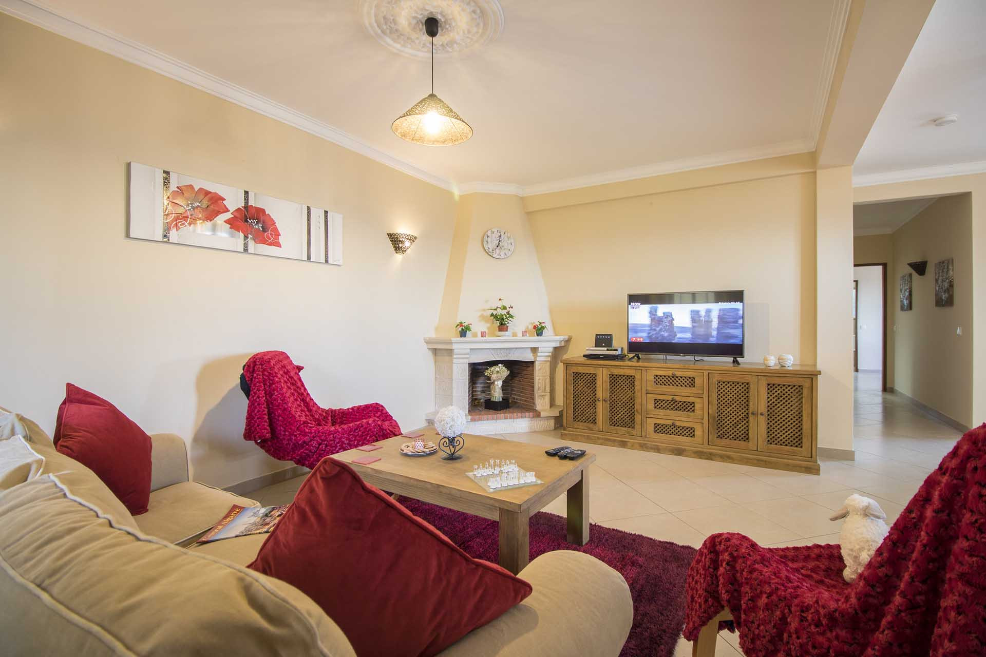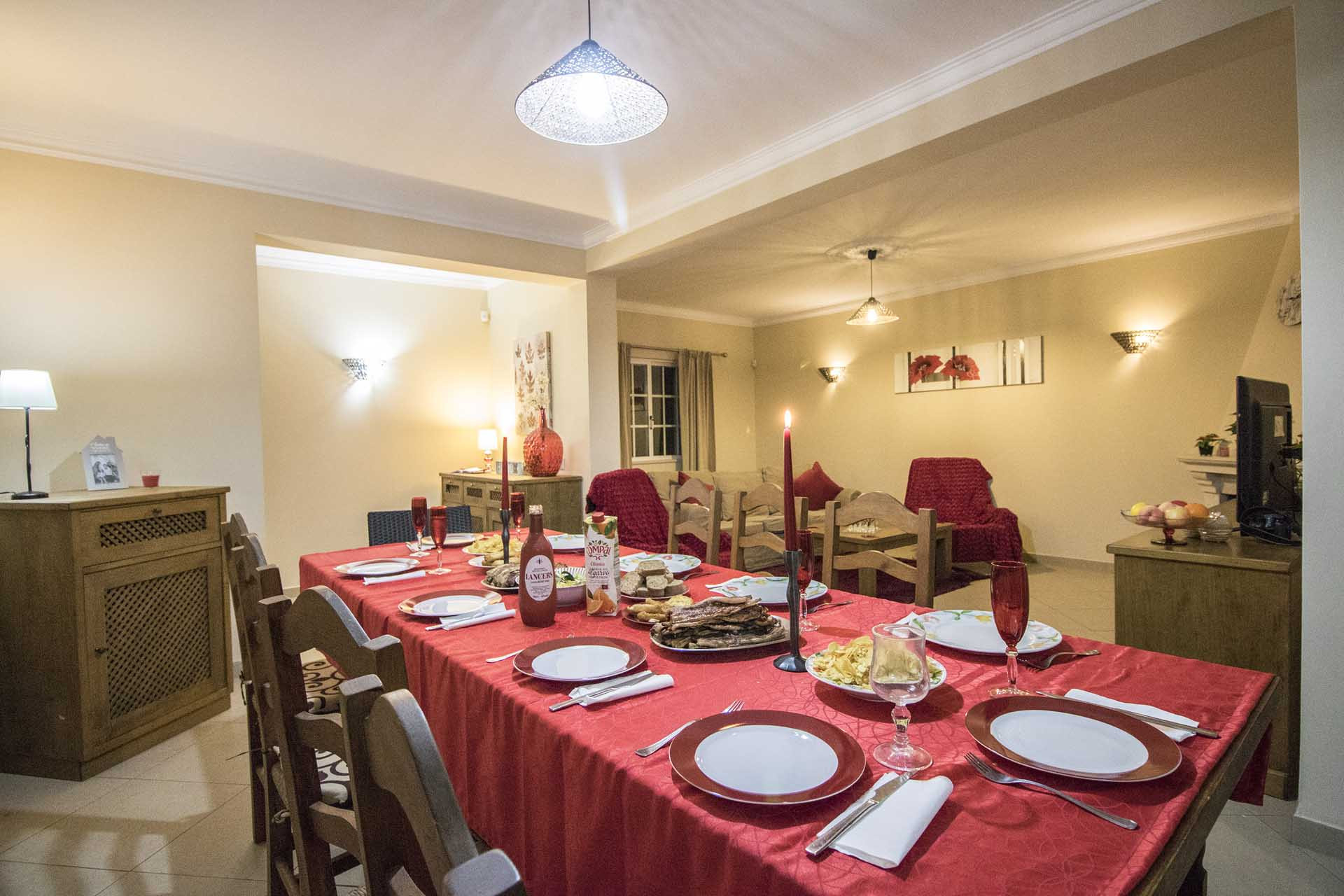 Na sala de estar/jantar, a comprida mesa de madeira convida a sentar um grande número de pessoas, para os dias mais frios a sala oferece uma lareira para se sentir em casa. Uma televisão de ecrã fino com canais por cabo e internet grátis ajudam a passar as férias e a gozar do momento.