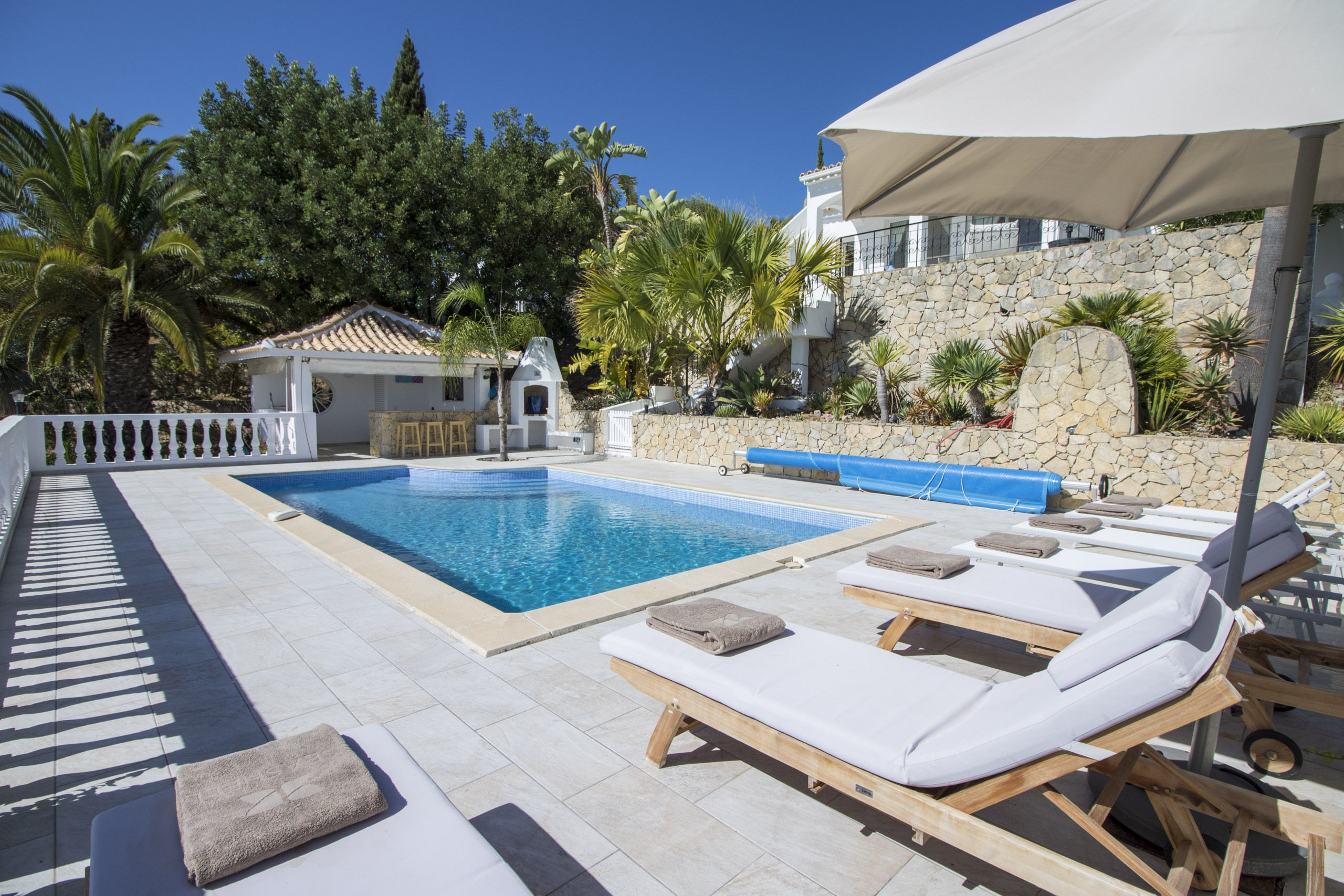 Idilic, quiet location. Spacious and well designed villa spread out on different levels. Short drive to local town with restaurants and supermarkets.