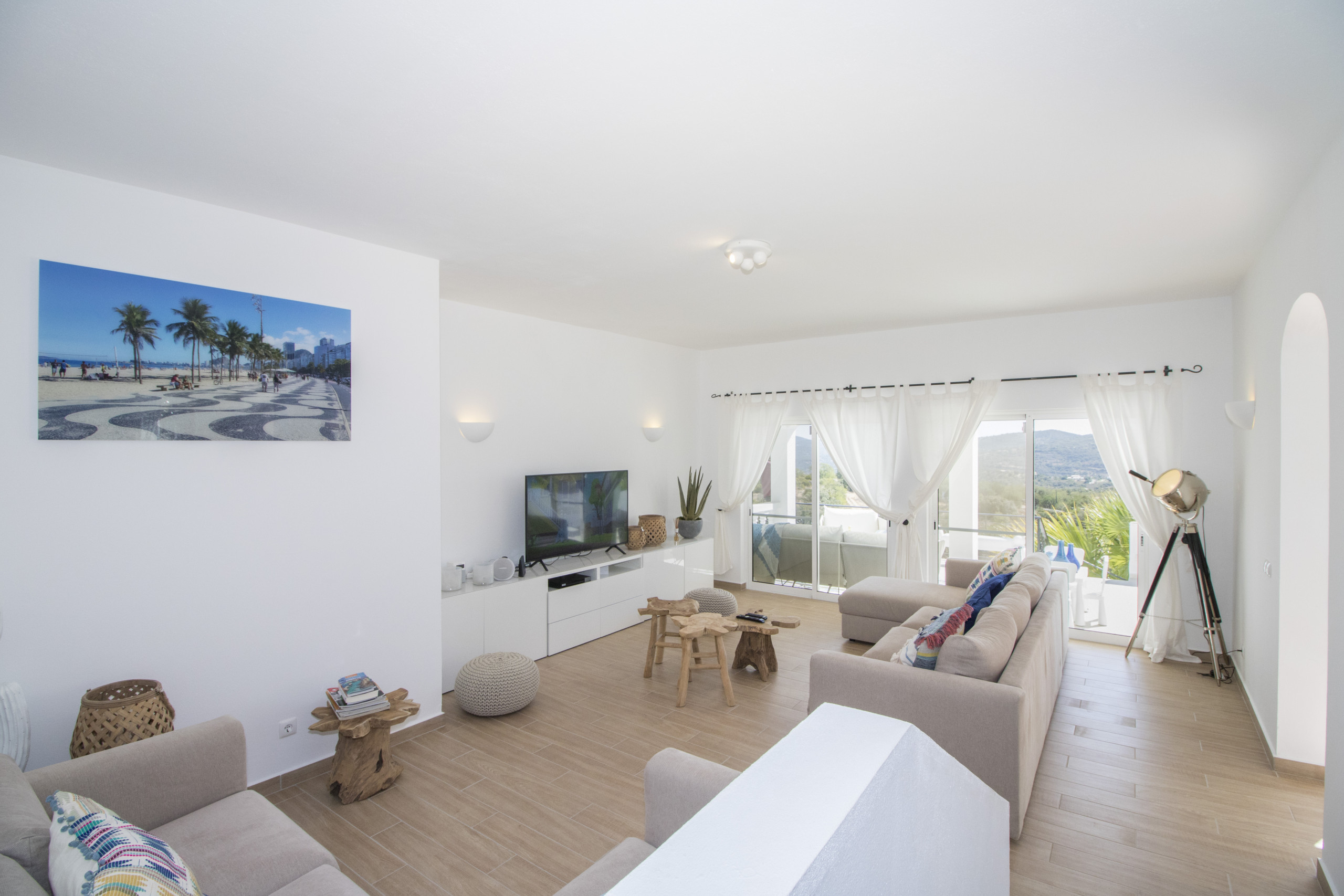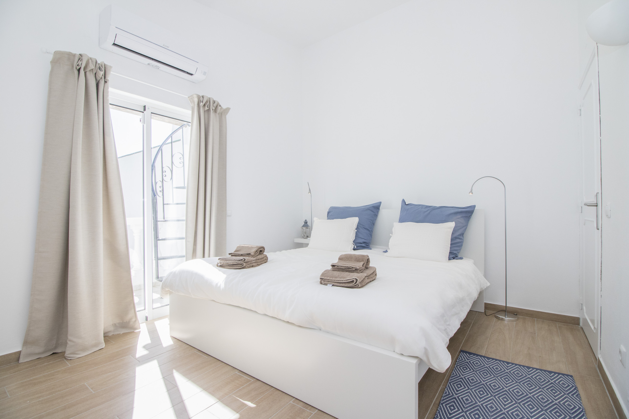 No interior, encontra cinco quartos com ar condicionado — quatro quartos de casal no rés do chão (dois em suite com duche, dois que partilham banheira), mais um quarto de casal em anexo com duche — além de uma casa de banho junto à piscina, garantindo espaço privado e confortável para todos. A ampla sala de estar tem ar condicionado, TV internacional, sistema de som e Wi‑Fi em toda a casa.