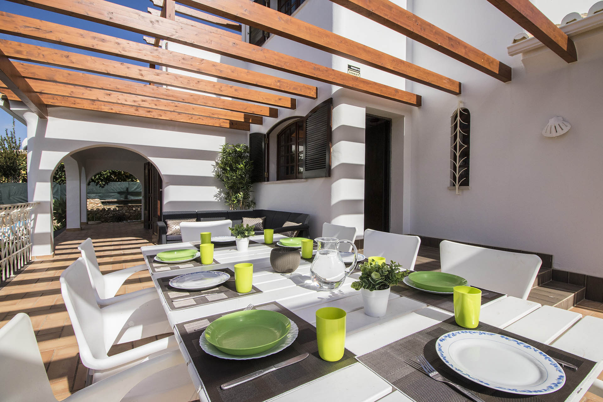 O exterior da moradia é bastante prático e amplo. A piscina é de dimensões standard e tem 8 metros de comprimento por 4 metros de largura, variável entre 1 metro e 2 metros de profundidade. A piscina tem a possibilidade de ser aquecida somente entre Abril e Outubro, através de um custo adicional (com um pedido efetuado no mínimo com 48h de antecedência), Contudo se as temperaturas estiverem demasiadamente baixas, poderá não ser possível o fornecimento do serviço.O exterior dispõe de área de B.B.Q. e mesa para 8 pessoas, com acesso fácil à cozinha, que lhe permitirá desfrutar de refeições ao ar livre nos dias quentes de Verão, sendo, no entanto, protegido por uma magnífica pérgula de madeira com tiras de lona para providenciar sombra nas horas de maior calor. Poderá passar rapidamente para a zona de lazer ao lado equipada com um sofá de canto de exterior.