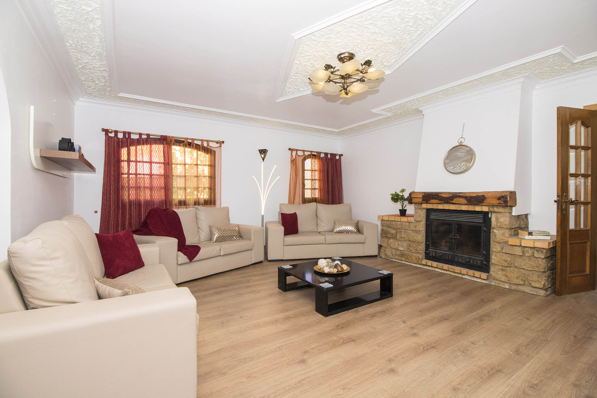 A sala dispõe de 2 sofás de 2 lugares e 1 de 3 lugares, lareira, móvel TV, TV e mesa de centro, de boas dimensões e acolhedora.