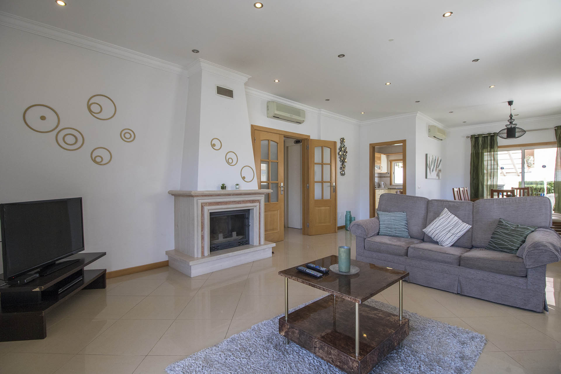 A sala de boas dimensões dispõe de 2 sofás de 3 lugares, lareira, TV com canais por cabo. Canais televisivos Nacionais e Internacionais.