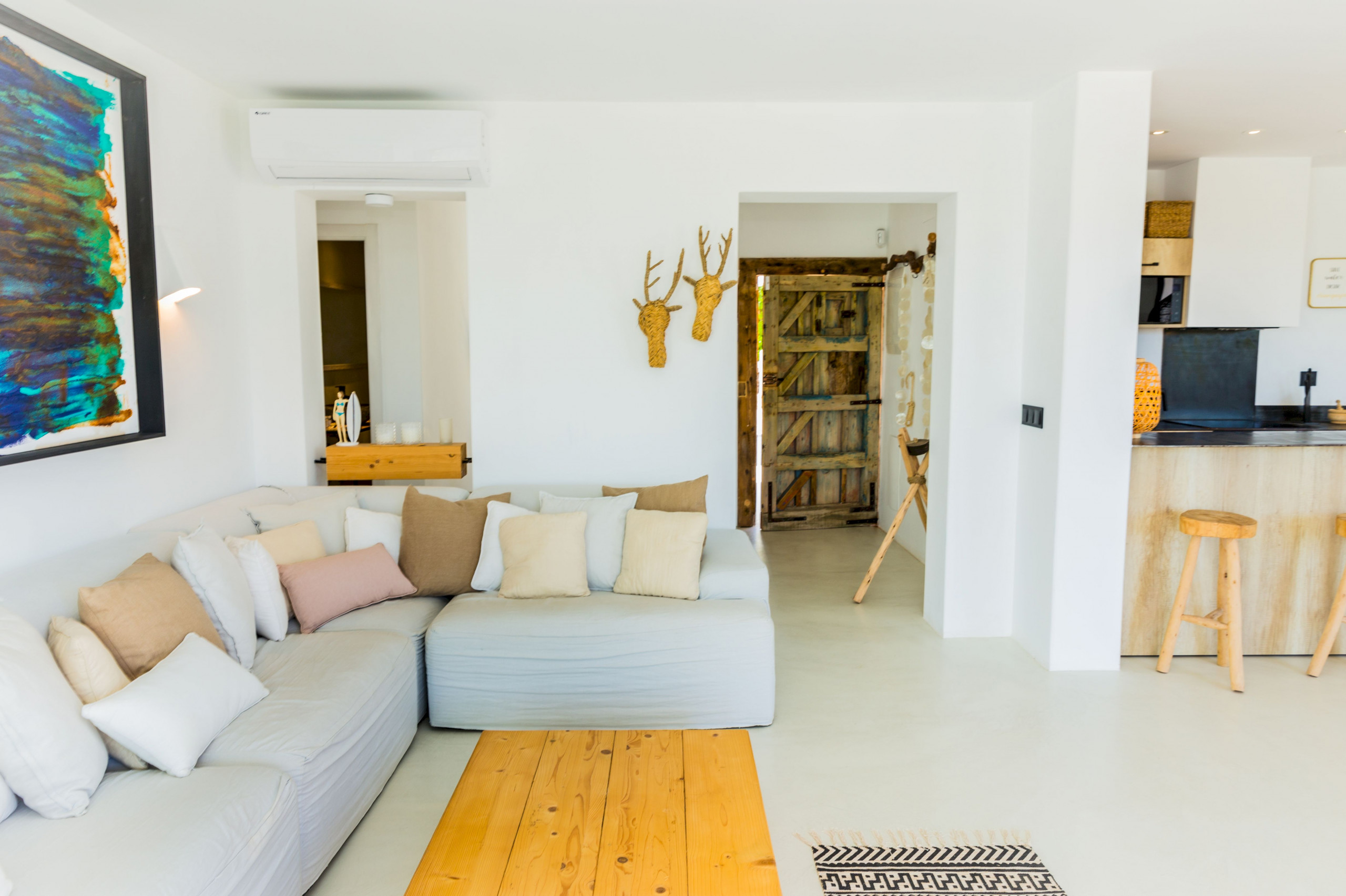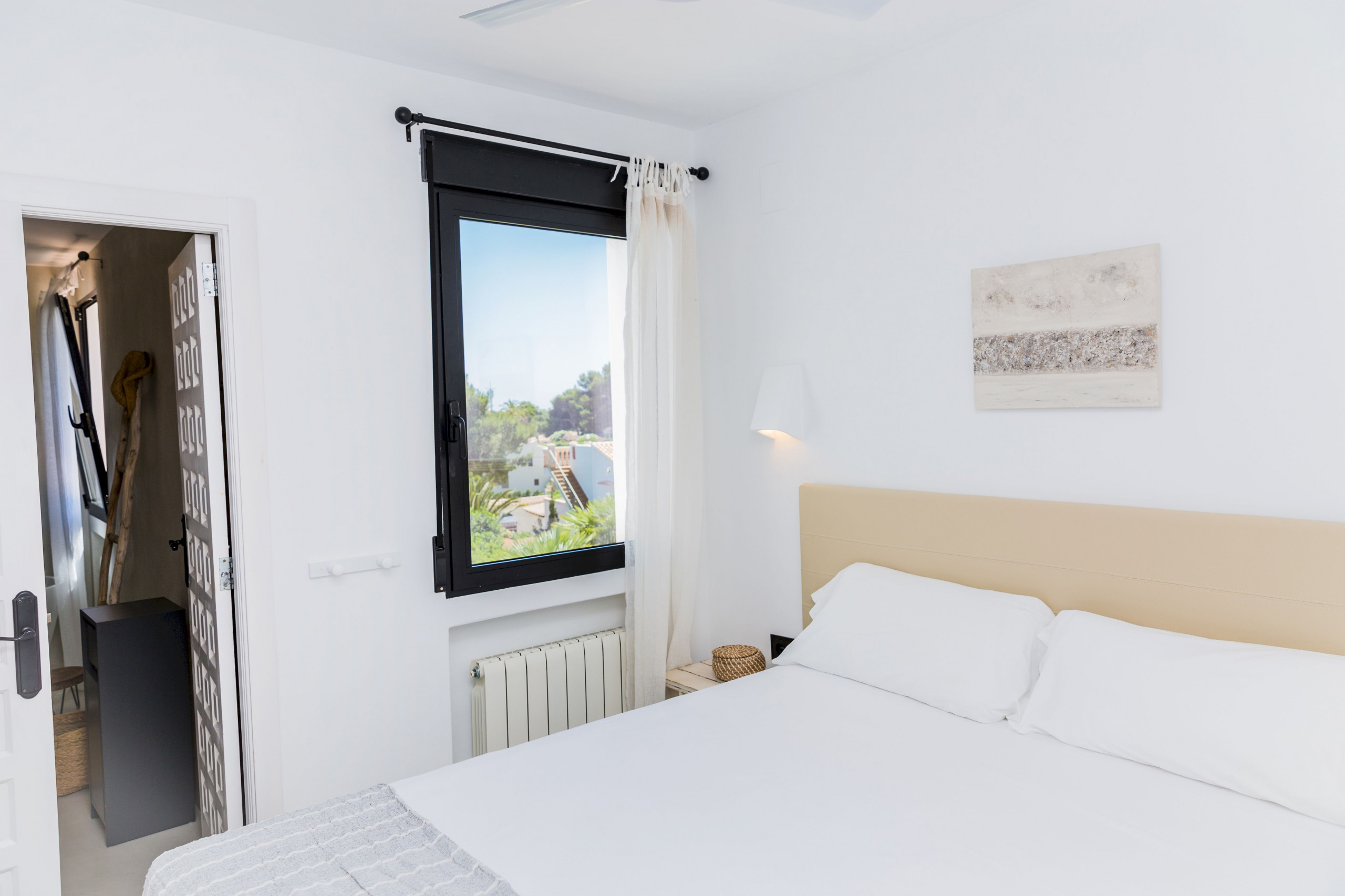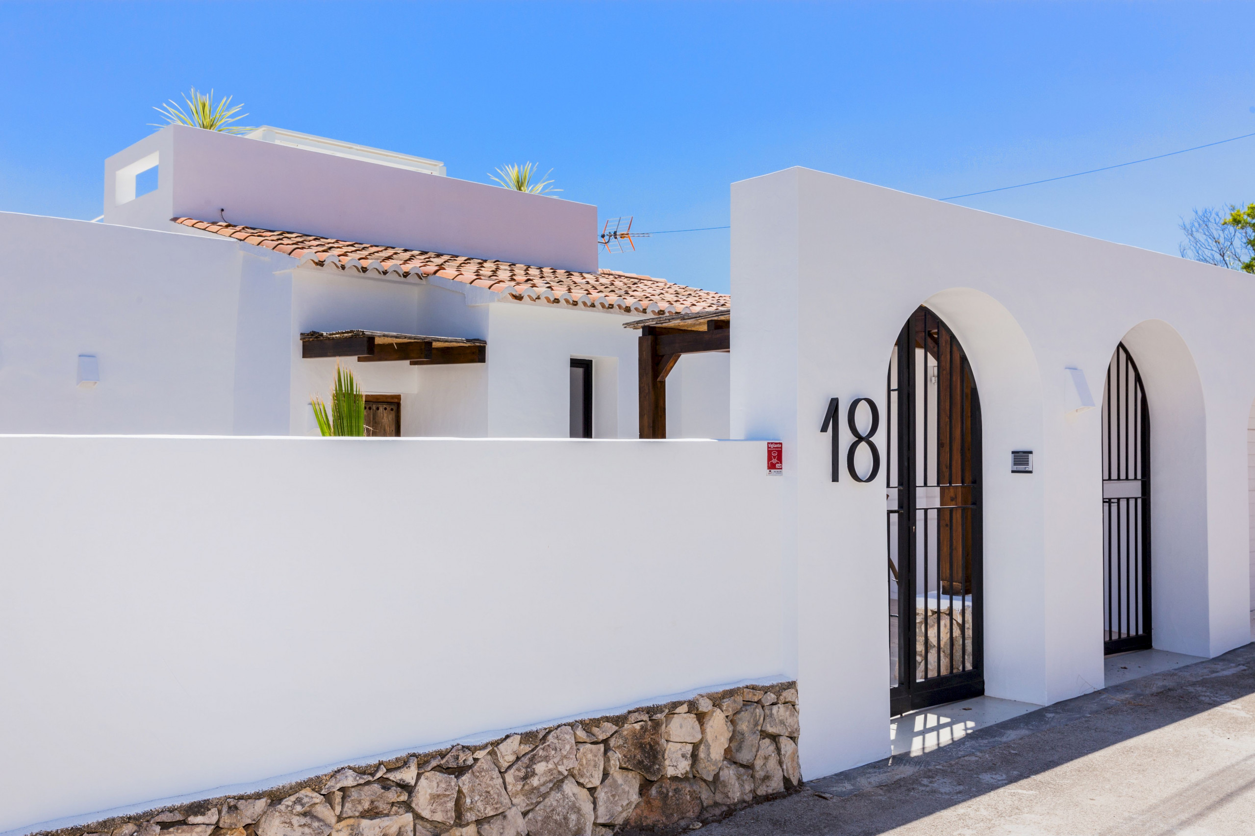 No piso principal, ao qual se acede diretamente da rua, a villa oferece uma sala luminosa com um sofá modular espaçoso para relaxar, ar condicionado, Smart TV e WiFi grátis. As grandes janelas da sala dão para uma excelente varanda com espreguiçadeira, cadeiras e vista para o mar, a partir da qual se sobe ao maravilhoso solário com uma zona chill out com cama balinesa e vistas incríveis. Junto à sala, o espaço aberto dá lugar a uma mesa de jantar elegante em madeira e a cozinha com balcão americano, que está totalmente equipada com indução, micro-ondas, forno, máquina de lavar louça, louça completa e utensílios de cozinha. Neste mesmo piso há uma das instalações sanitárias e um quarto de casal com casa de banho em suite. A segunda instalação sanitária e os outros três quartos, cada um com a sua casa de banho em suite, encontram-se no piso inferior. Todos os quartos têm camas de casal tamanho queen, casa de banho em suite e ar condicionado.