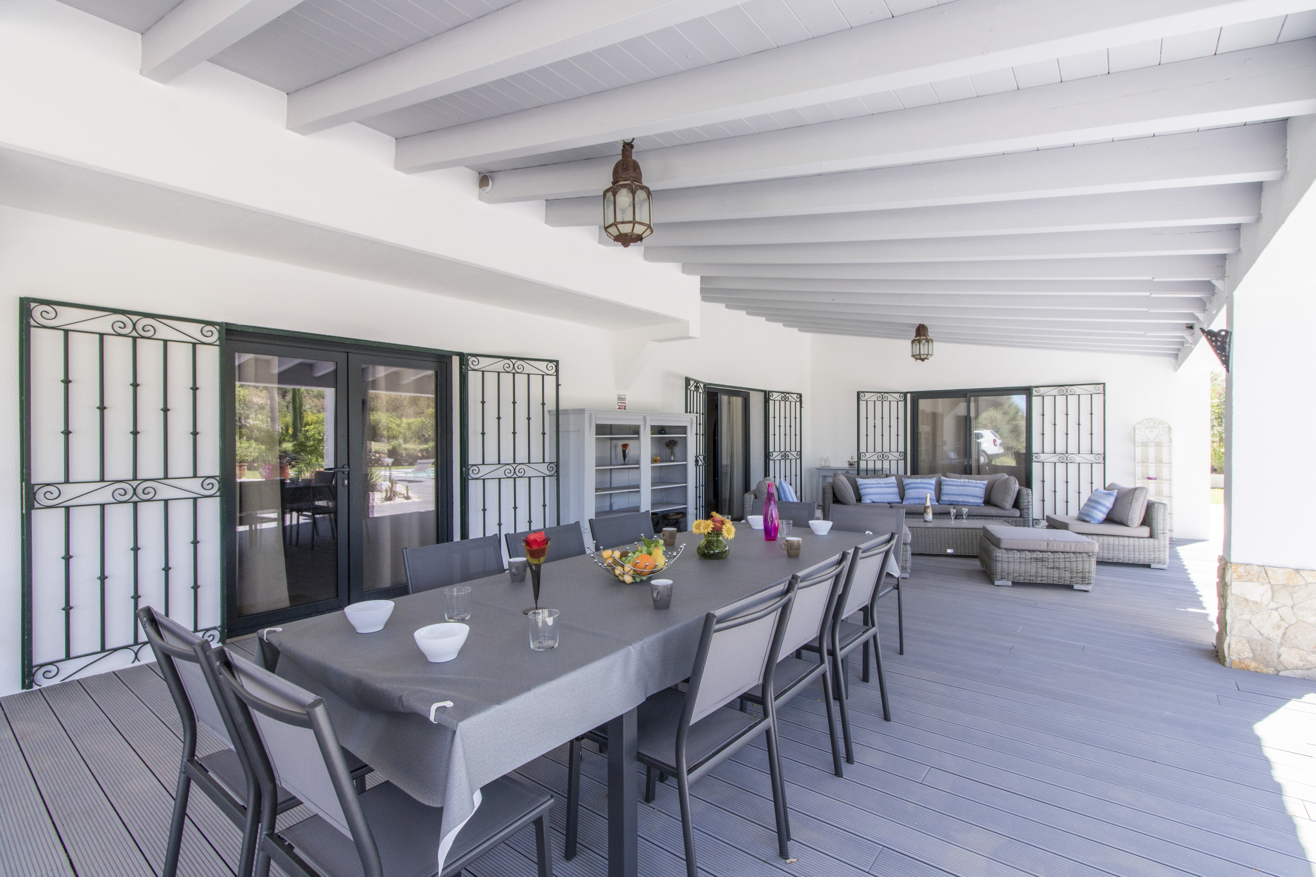Existe um espaço coberto com mesa de refeição e mobiliário exterior.