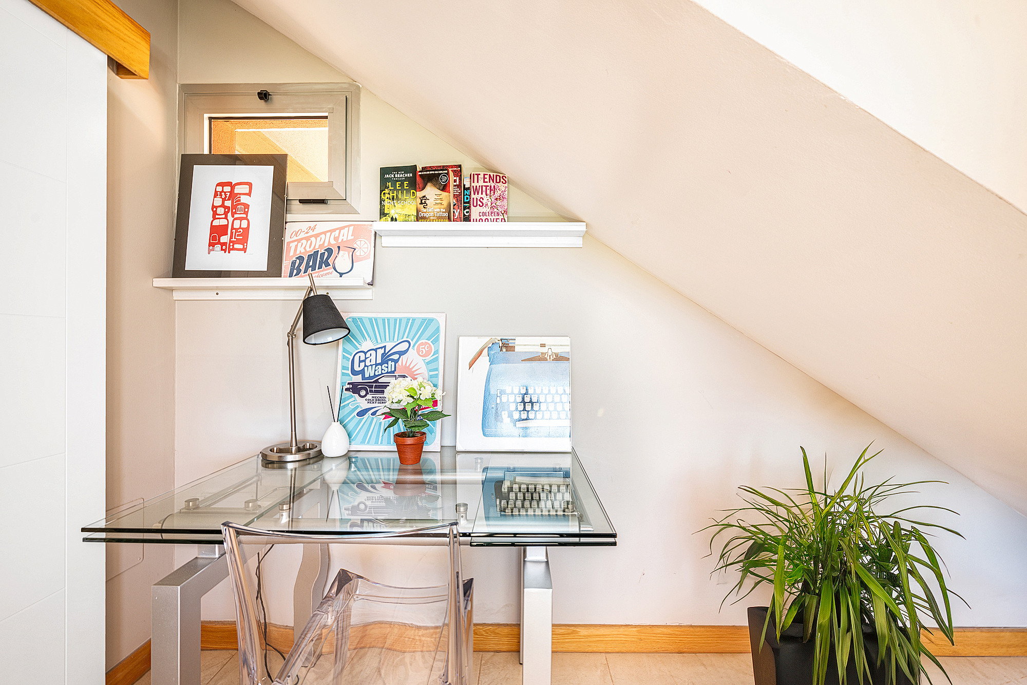 A sala tem também uma grande mesa de jantar redonda, bem como uma pequena área de trabalho com mesa e cadeira para trabalhar confortavelmente.