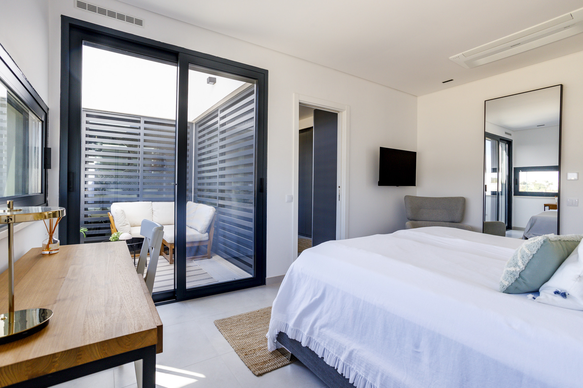 A vivenda possui cinco quartos espaçosos com casa de banho privativa, proporcionando a cada hóspede o seu próprio espaço privado. Interiores luminosos, linhas arquitetónicas limpas e acabamentos de alta qualidade criam uma atmosfera calma e elegante em toda a casa. Grandes áreas de estar interiores e exteriores facilitam o convívio, seja a relaxar junto à piscina, a jantar na varanda ou a descontrair após um dia passado em Tavira.