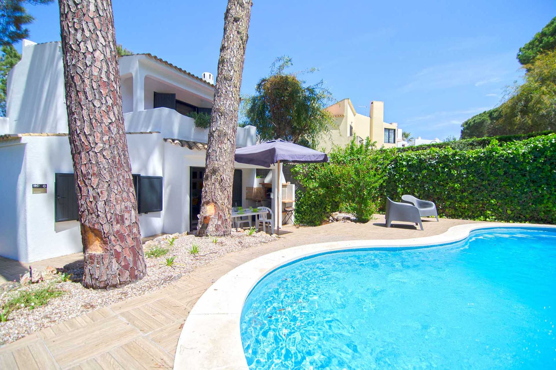 Piscina privada com cerca de 8 metros de comprimento por 4 de largura com 1 metro de profundidade junto às escadas e 2 metros na parte mais funda. A piscina tem a possibilidade de ser aquecida somente entre Abril e Outubro, através de um custo adicional (com um pedido efetuado no mínimo com 48h de antecedência), Contudo se as temperaturas estiverem demasiadamente baixas, poderá não ser possível o fornecimento do serviço. Existe um espaço de relva junto ao campo de golfe, perfeito para colocar as espreguiçadeiras e relaxar bem como uma barbecue a carvão convenientemente colocado à sombra e junto à mesa de jantar exterior.