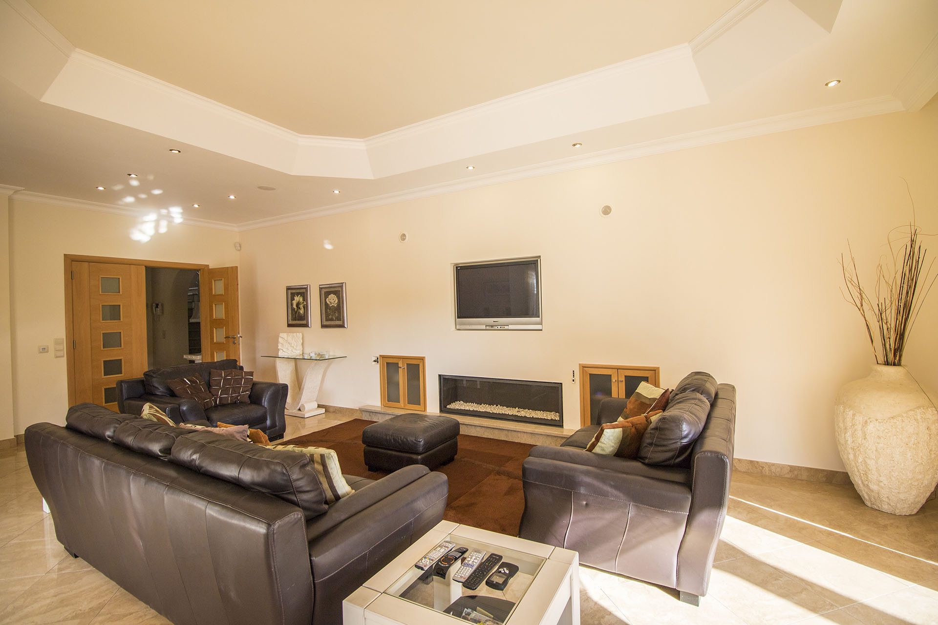 Ao entrar para a sala de estar, com uma excelente iluminação natural, ao longo do dia, decorada com um sofá em pele e almofadas de pelúcia, uma televisão de ecrã plano por cima da lareira a gás, que promovem um ambiente quente e acolhedor.