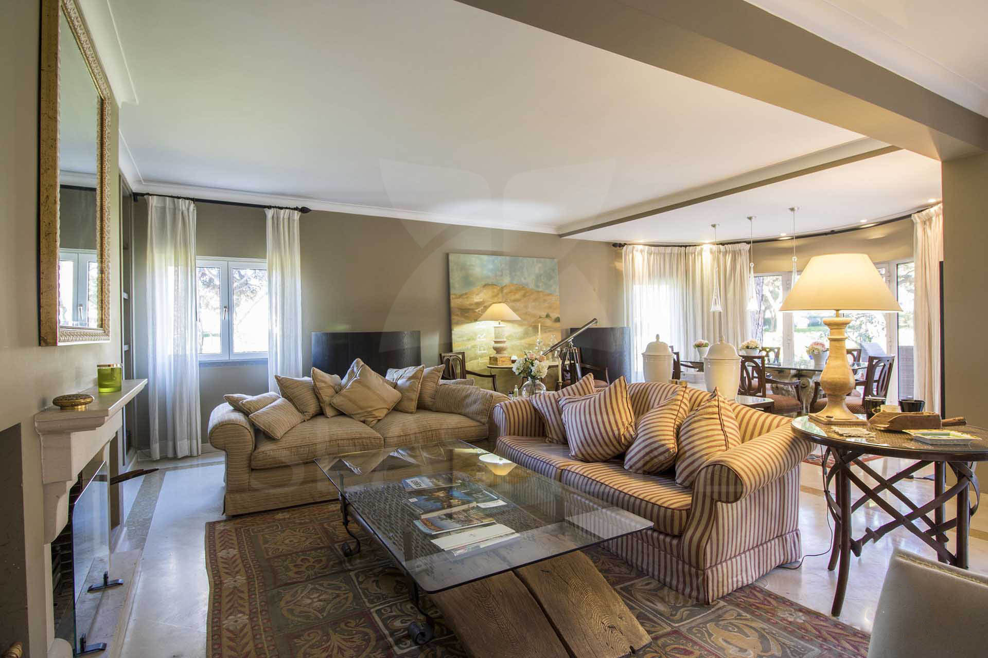A sala está decorada em tons de castanho e com objetos decorativos ímpares dando a sala um toque de sofisticação. Os móveis são de qualidade e harmoniosamente colocados. Existe uma área de jantar com uma grande mesa de vidro para as suas refeições no interior. Toda esta área tem enormes portas-janelas de acesso direto ao exterior e zona da piscina.