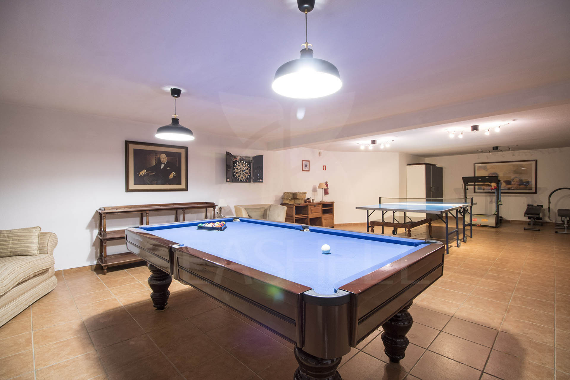 Ao descermos para a cave deparamo-nos com uma segunda sala de estar com sofás e mais uma televisão para disfrutar com toda a calma de um filme. Igualmente na cave temos uma área de lazer equipada com mesa de ping-pong, bilhar, um jogo de setas e algum equipamento de fitness como passadeira de corrida, banco de abdominais entre outros.