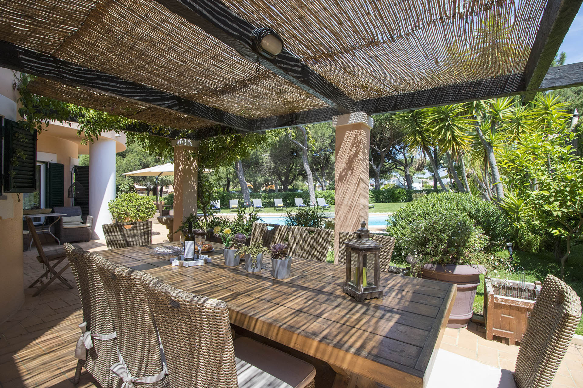 A zona exterior desta moradia é composta por um grande jardim relvado com plantas, flores e alguns pinheiros adultos que providenciam uma sombra refrescante. Para os amantes de golfe o jardim faz divisão para um dos melhores campos de golfe de Vilamoura o “Pinhal”.