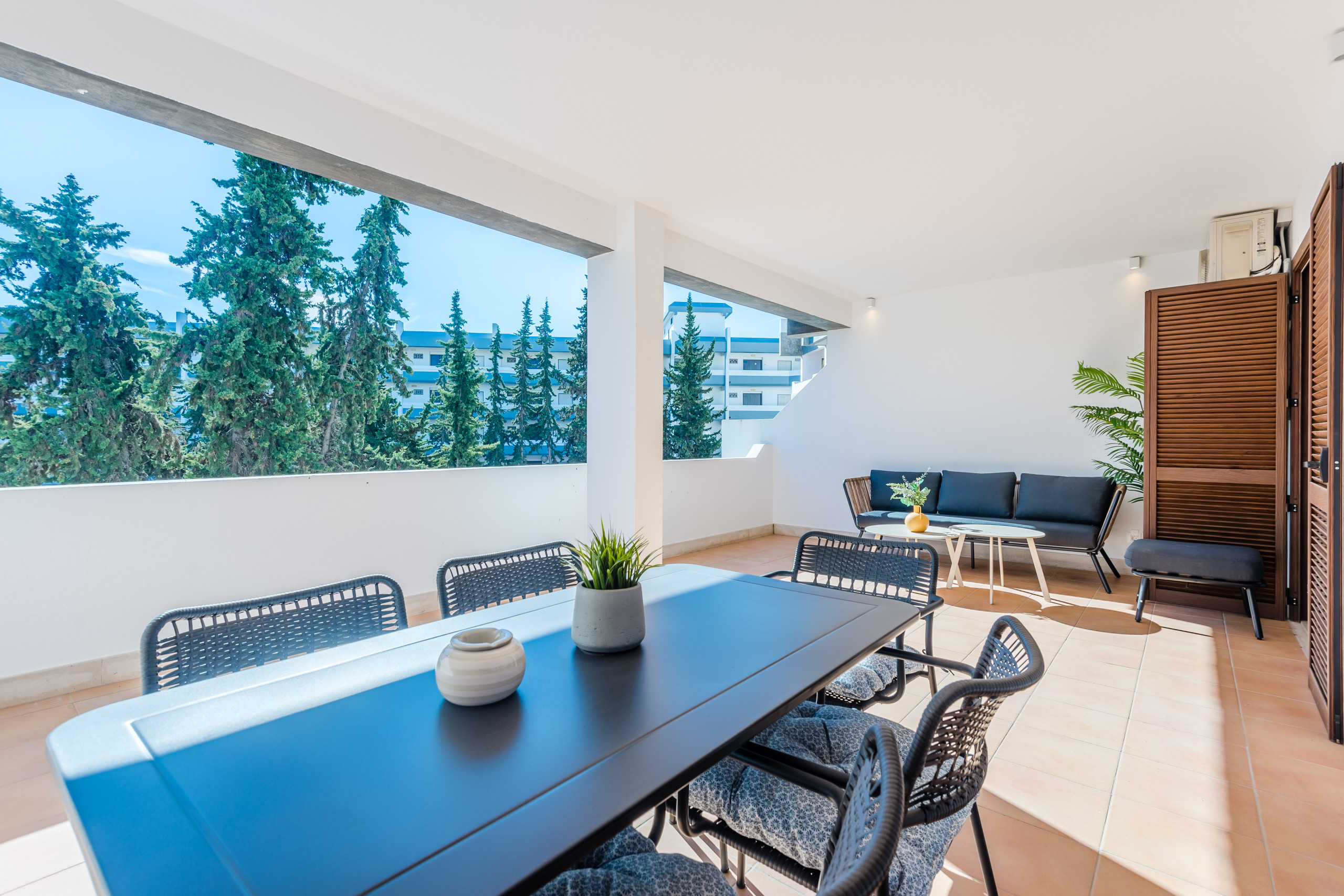 The apartment has a very large balcony (approx. 30m2), accessible from both the living room and the main bedroom. Outside there is a sofa, and a dining table. The balcony is south facing.
