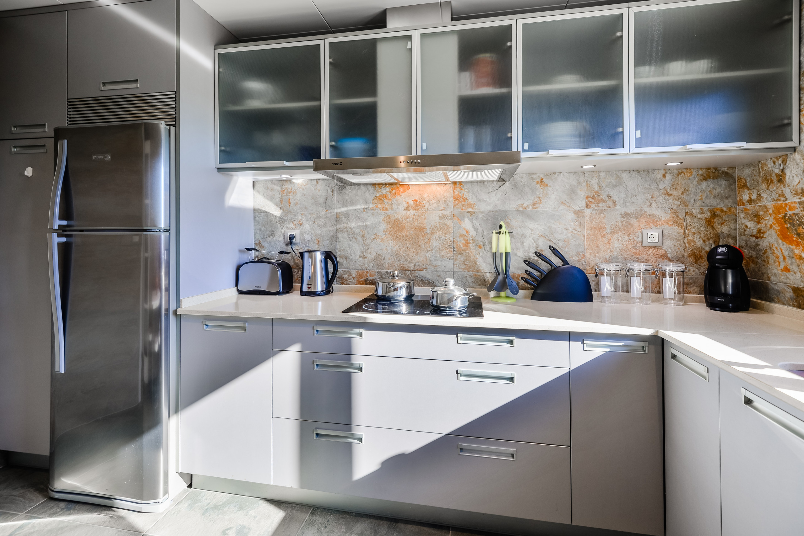 In the vitroceramic independent kitchen, refrigerator, microwave, oven, freezer, washing machine, dishwasher, dishes/cutlery, kitchen utensils, coffee machine, toaster, kettle and juicer are provided.