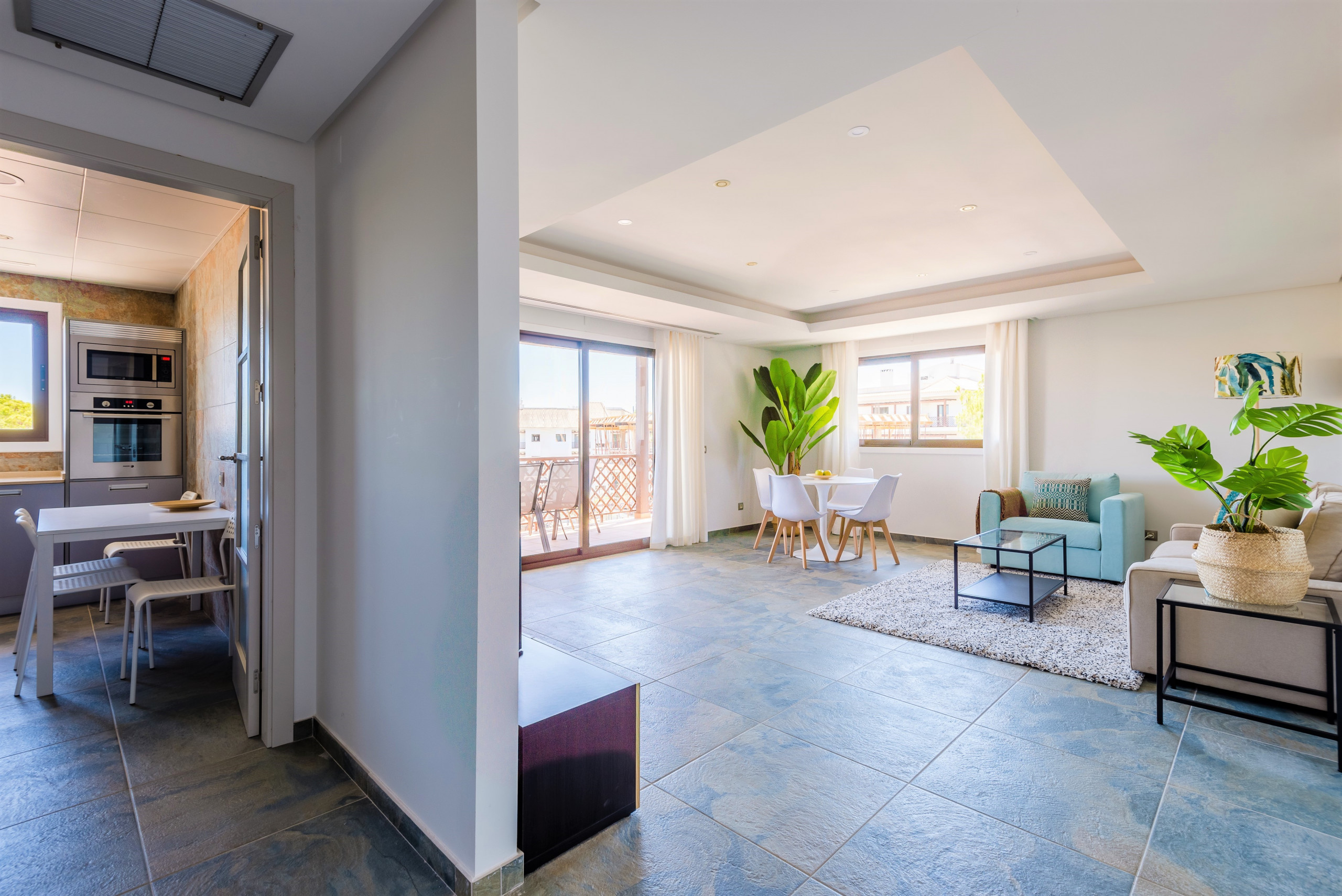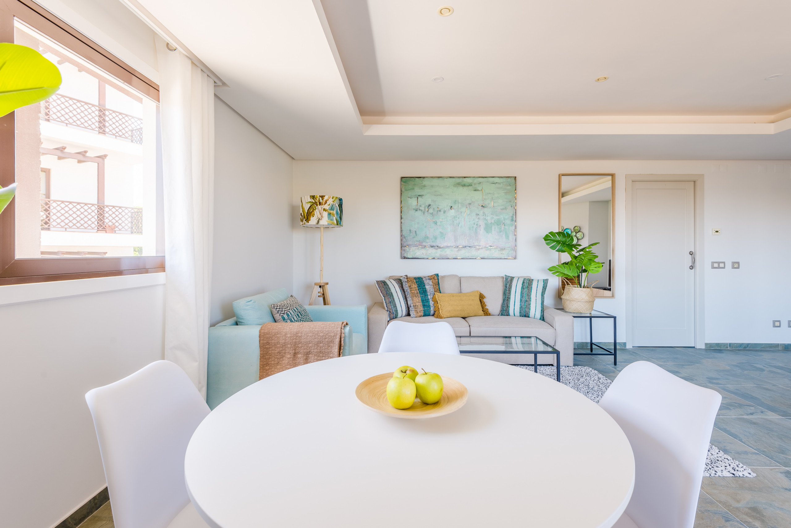 The apartment has a balcony from both the living room and the main bedroom. Outside there are chairs, a dining table and a barbecue. There is also a fabulous egg chair. The apartment faces towards the ocean.