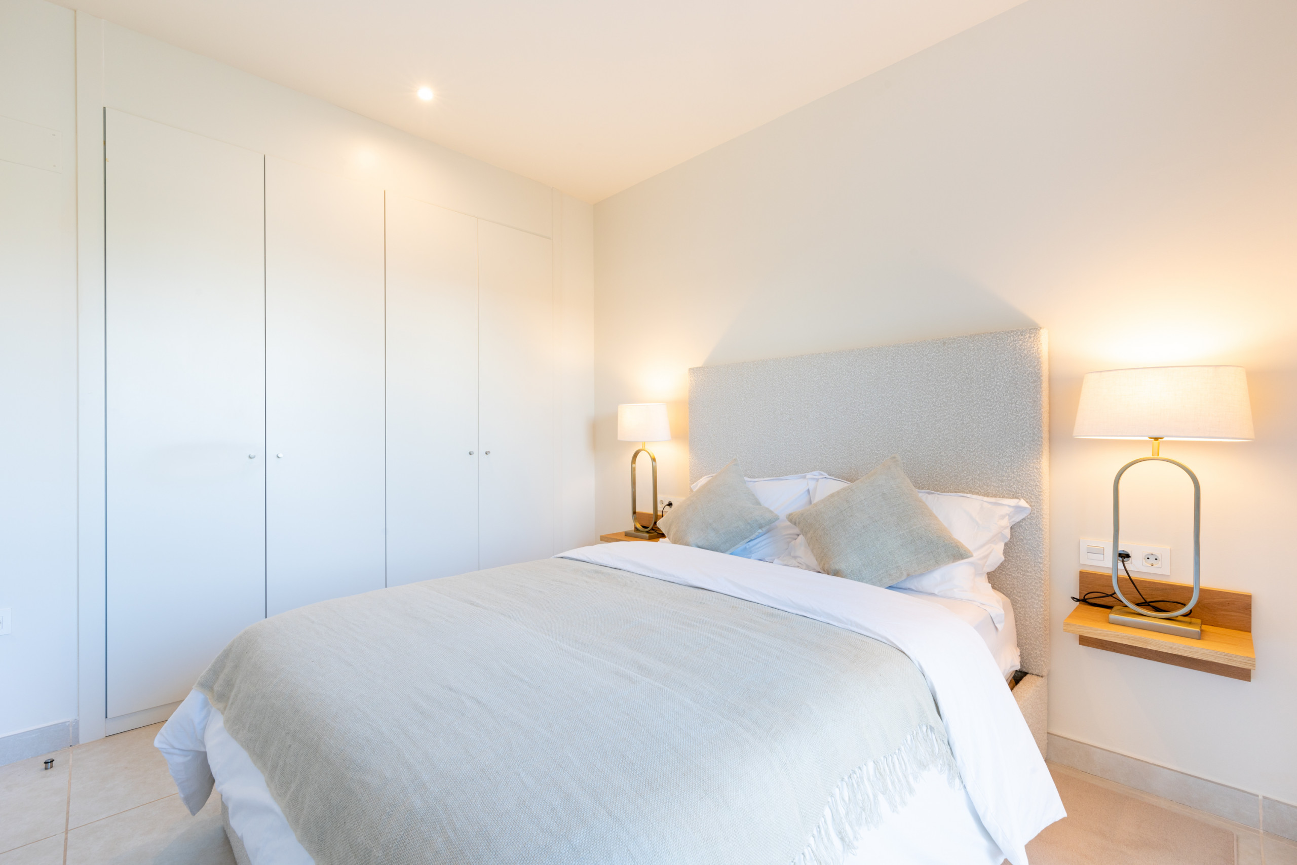 Bedroom 2: Double bed, wardrobe, access to a private balcony, and adjacent bathroom