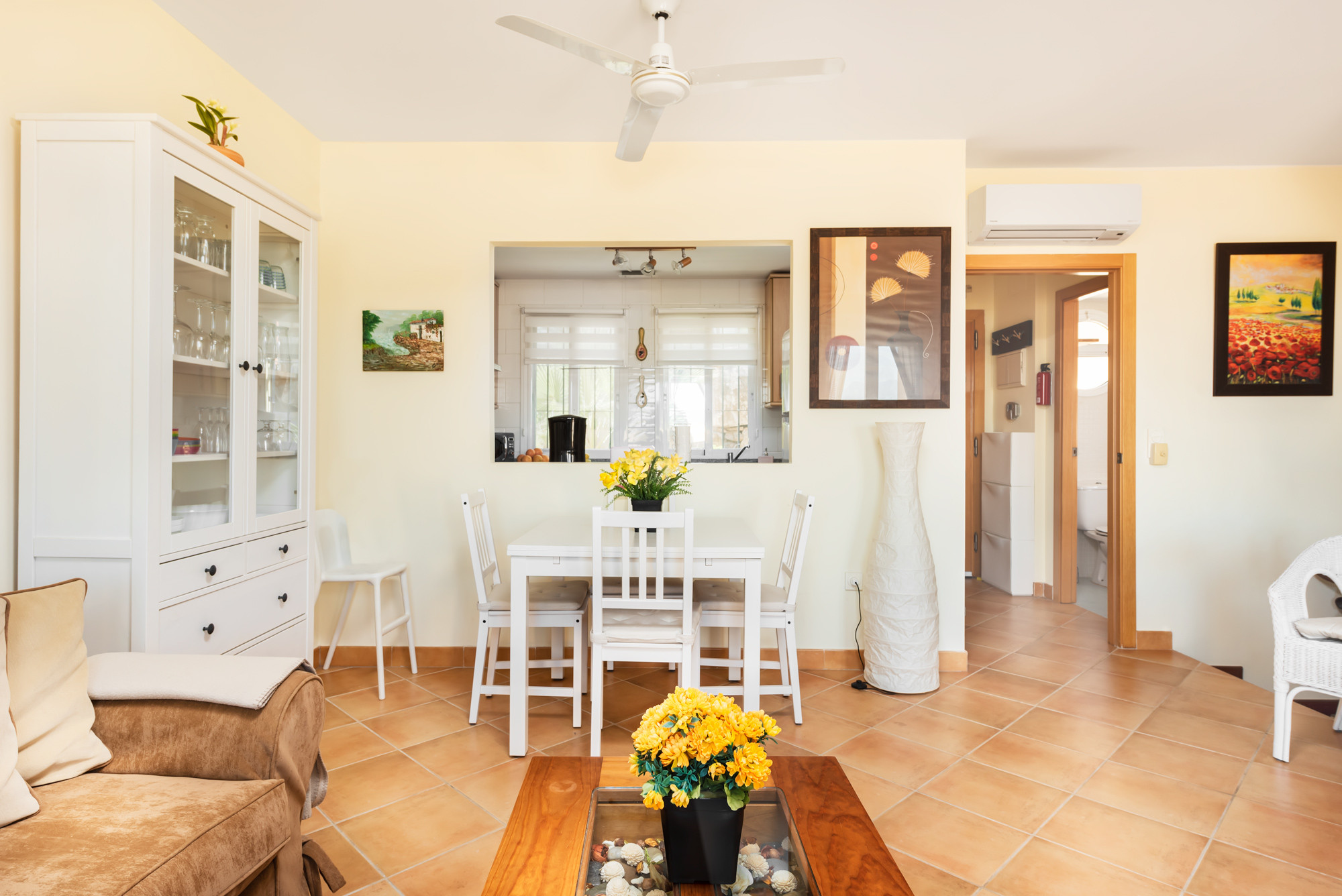 The kitchen is equipped with all the basic things and have oven, microwave, dishwasher, coffee machine, etc. Next to the kitchen you have the living room which contains a dining area and a cosy sofa area where there is TV with lots of different channels (Scandinavian, UK, German, etc.). There is direct access to the terrace which has garden furniture and sunbeds. From this terrace there is access to a large roof terrace and here you can enjoy meals at all times of the day while enjoying the beautiful view to the nearby mountains and Mediterranean Sea.