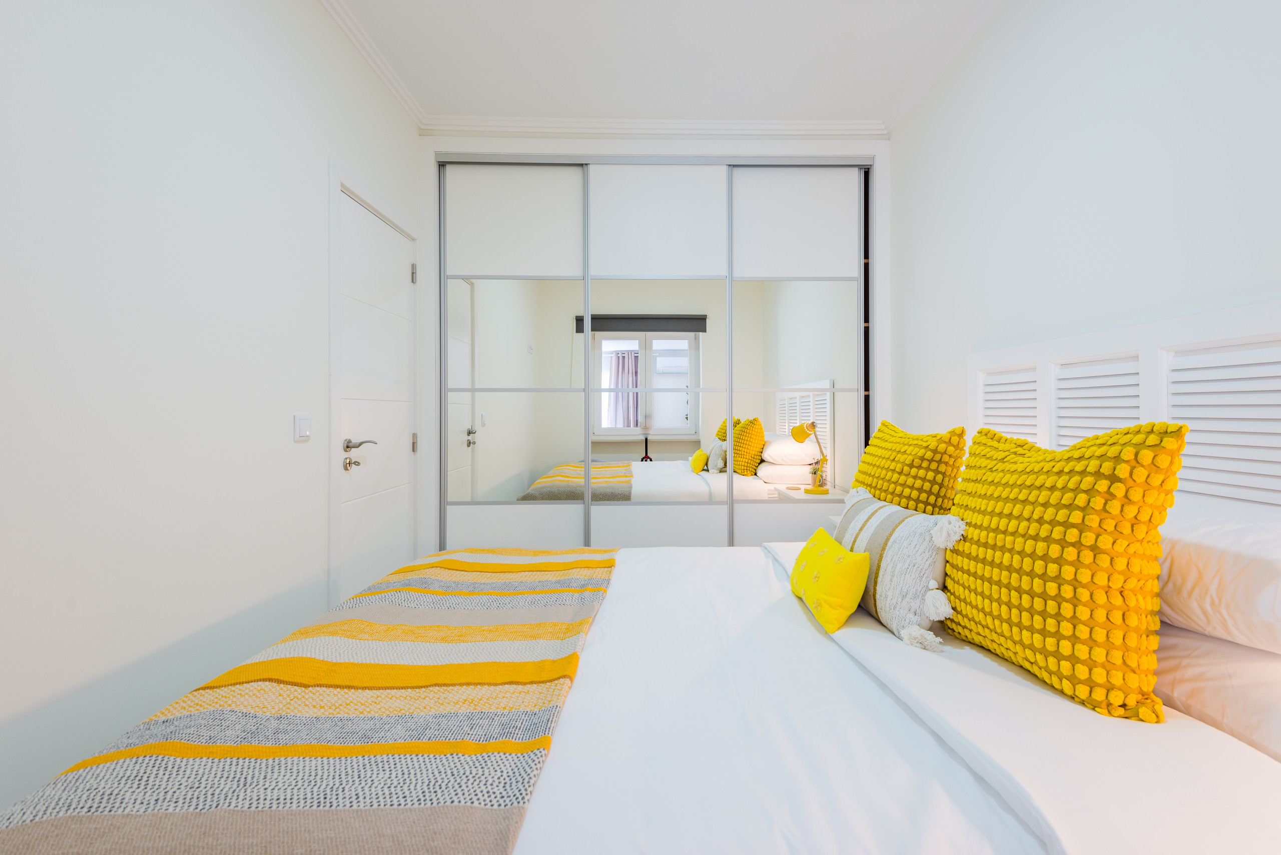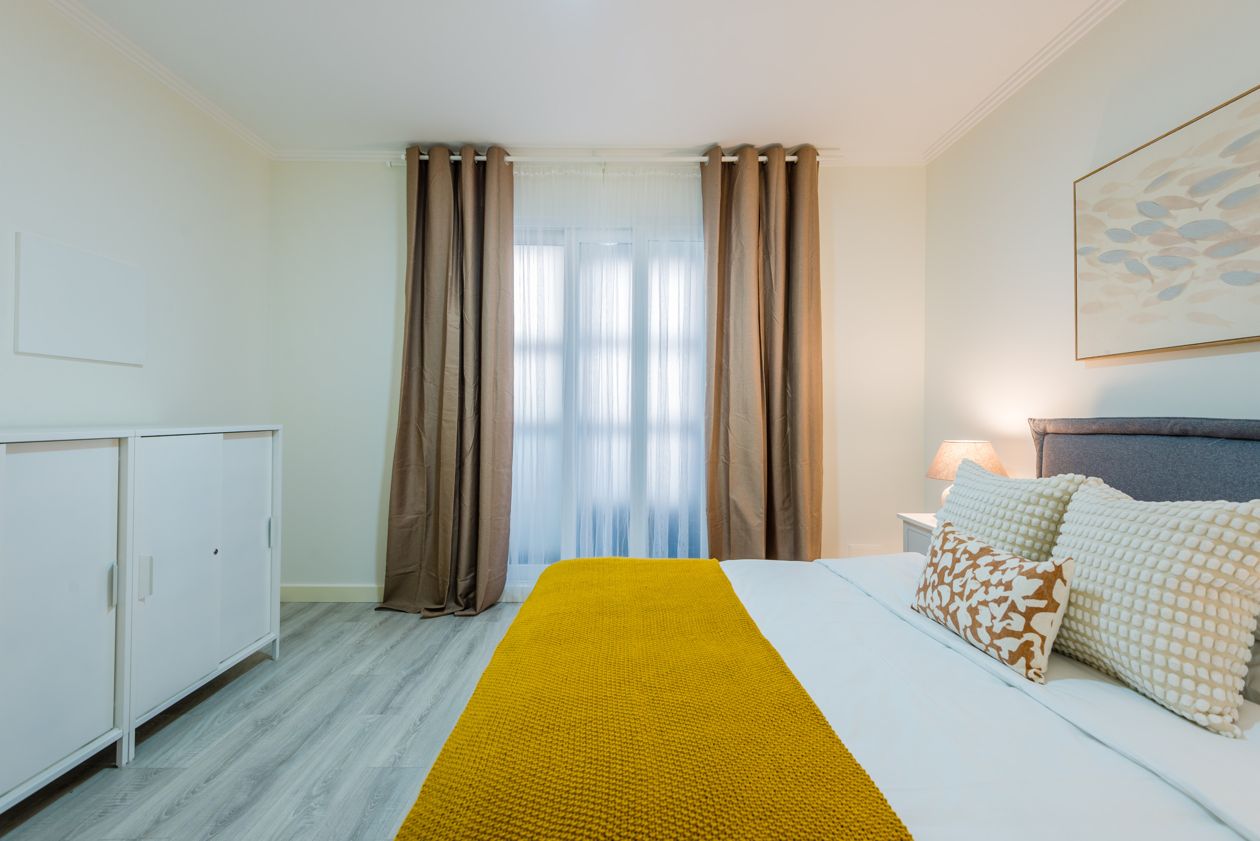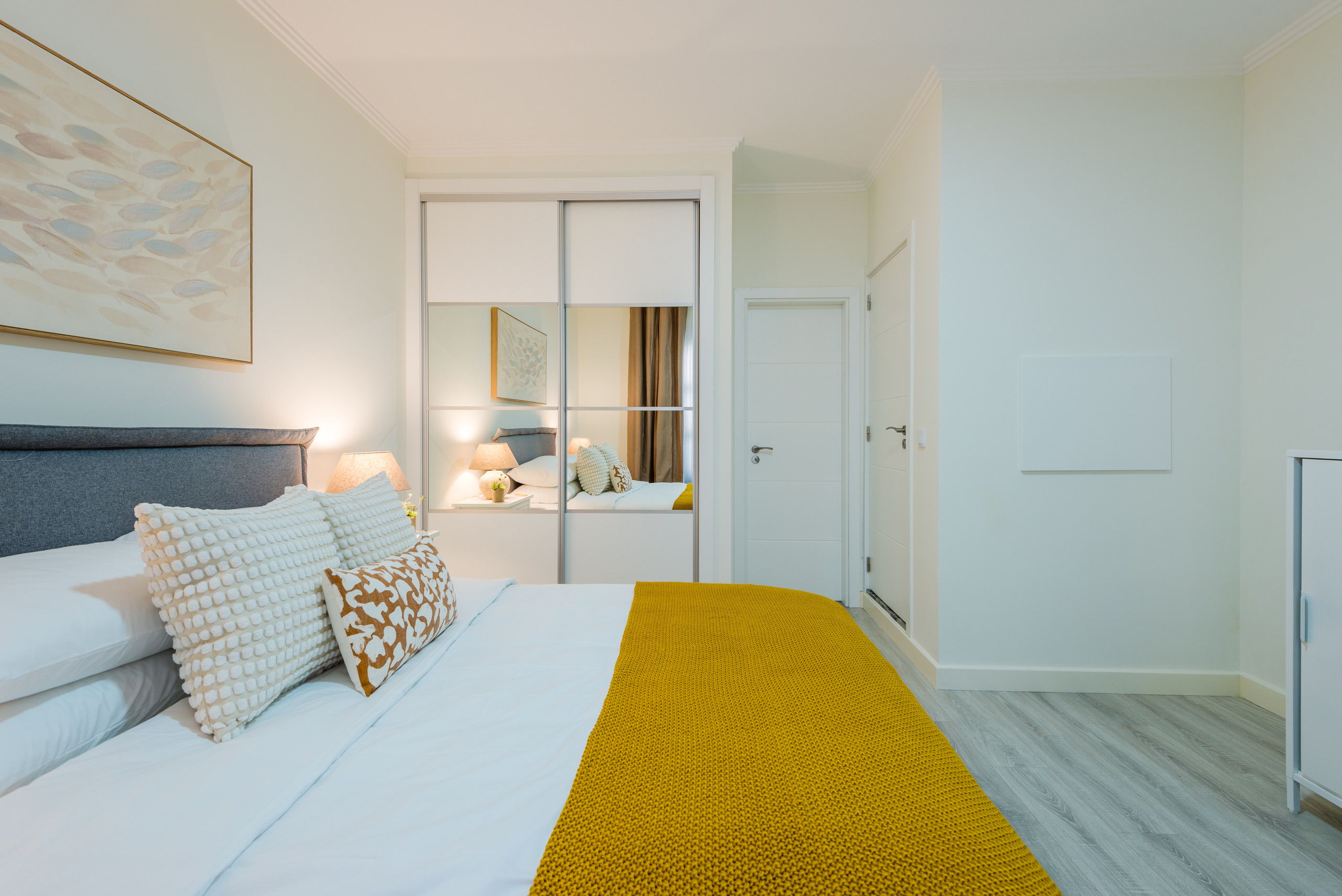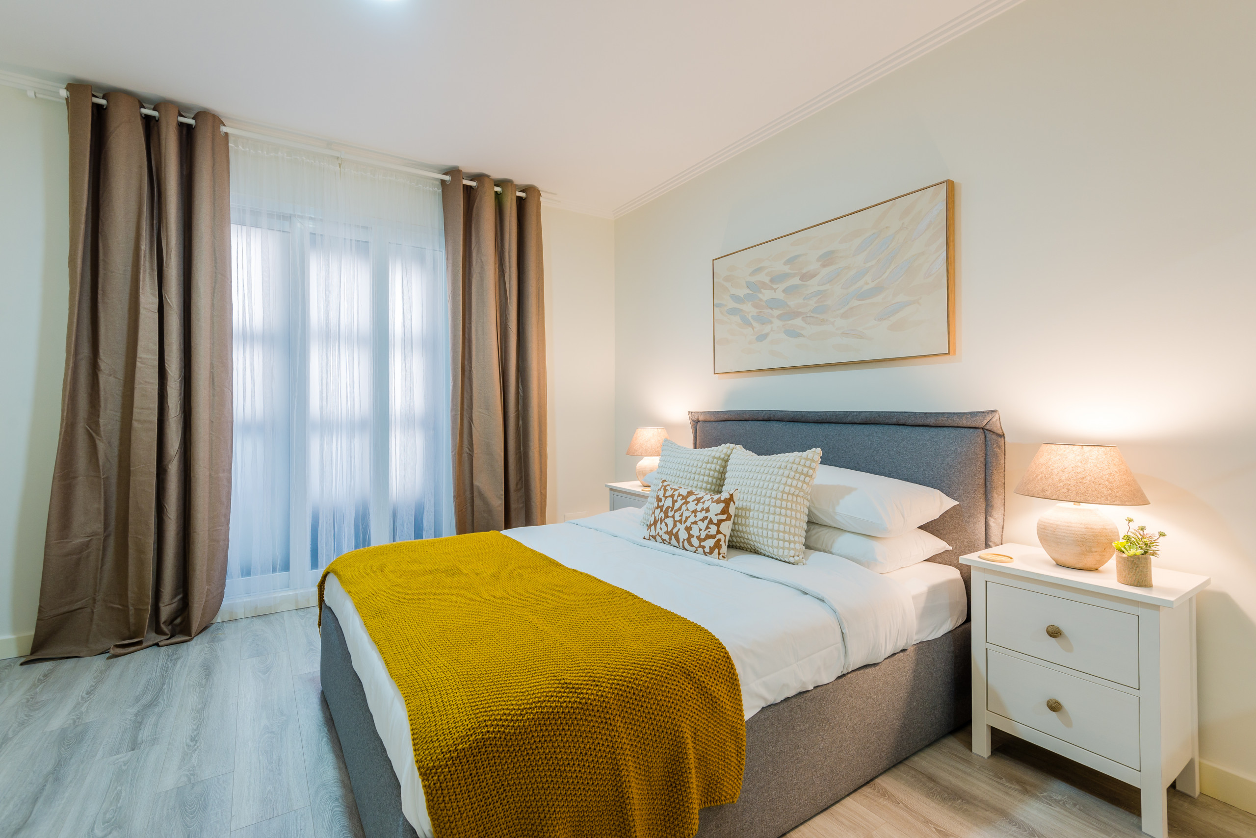 This modern apartment has capacity for 6 people, with 2 double bedrooms (one en-suite) and a third bedroom with two bunk beds. There is an additional shared bathroom.