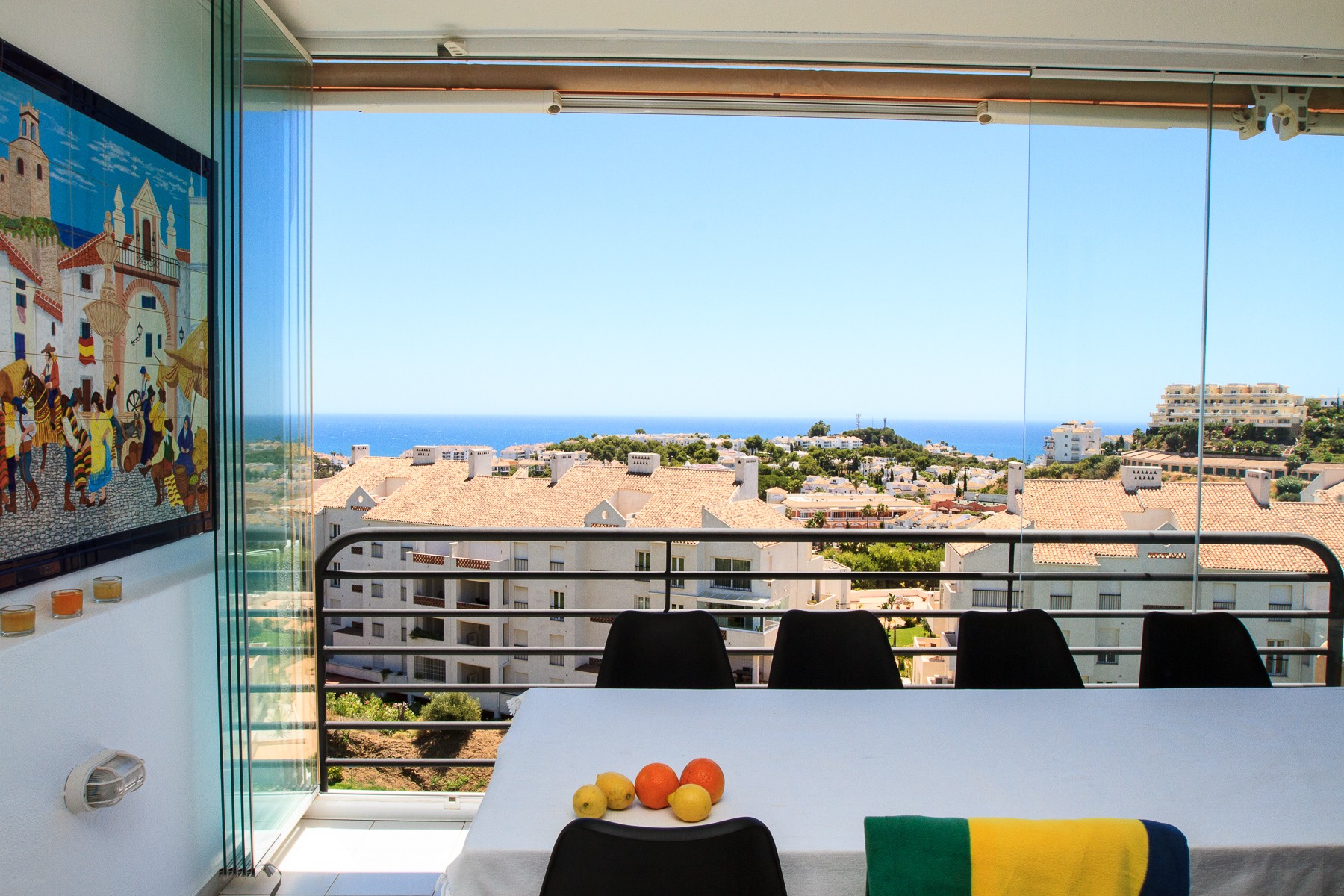 Nice entrance with direct access to bright and beautifully furnished living room with comfortable sofa, flat screen TV, Wifi and air conditioning. There is direct access to the south-facing terrace and the large floor-to-ceiling sliding glass doors provide both a fantastic light in the living room and a truly unique view of the golf course and the Mediterranean.