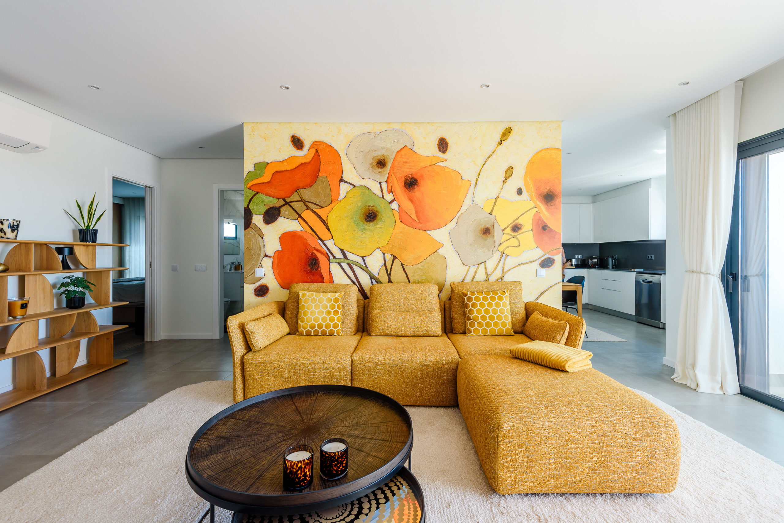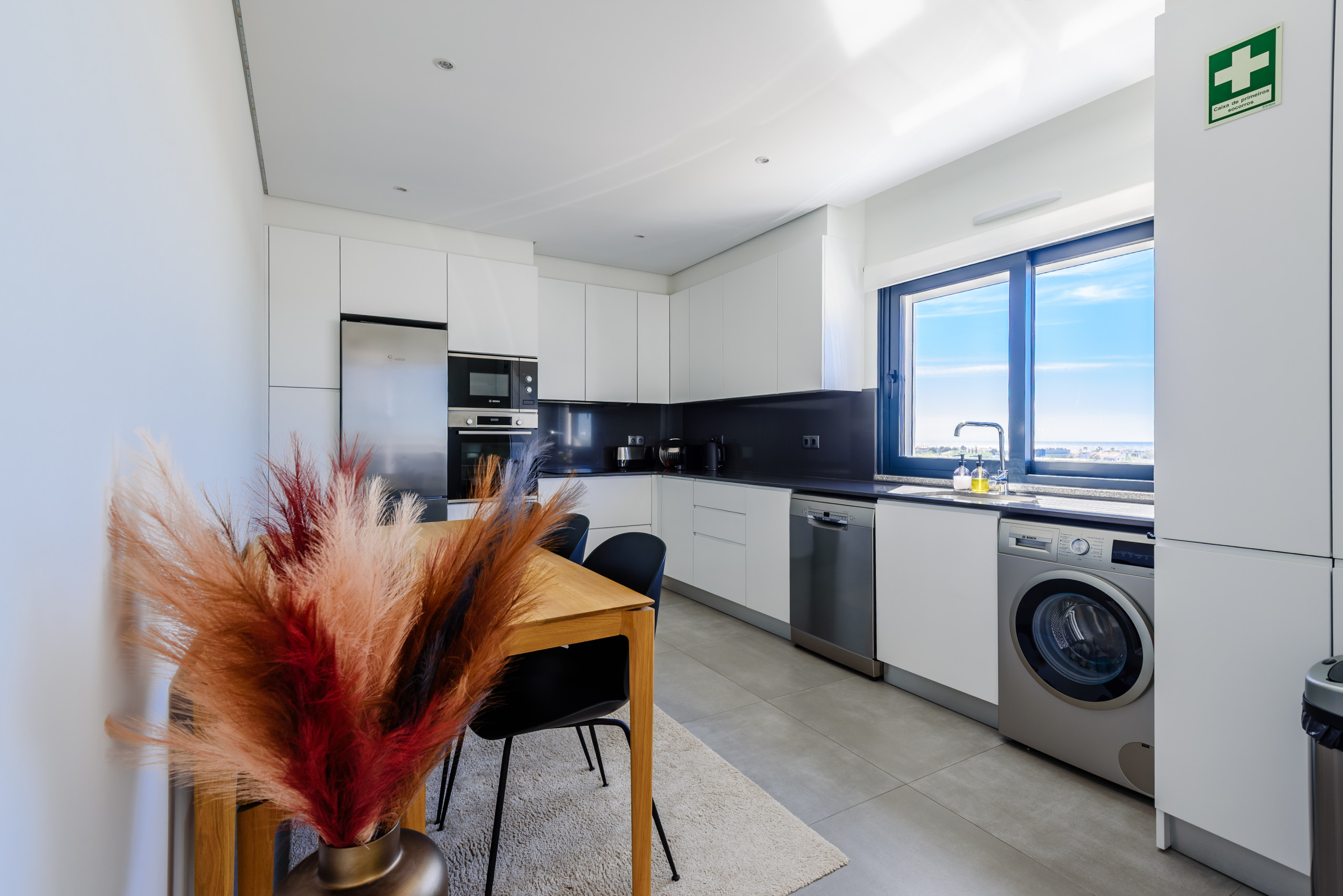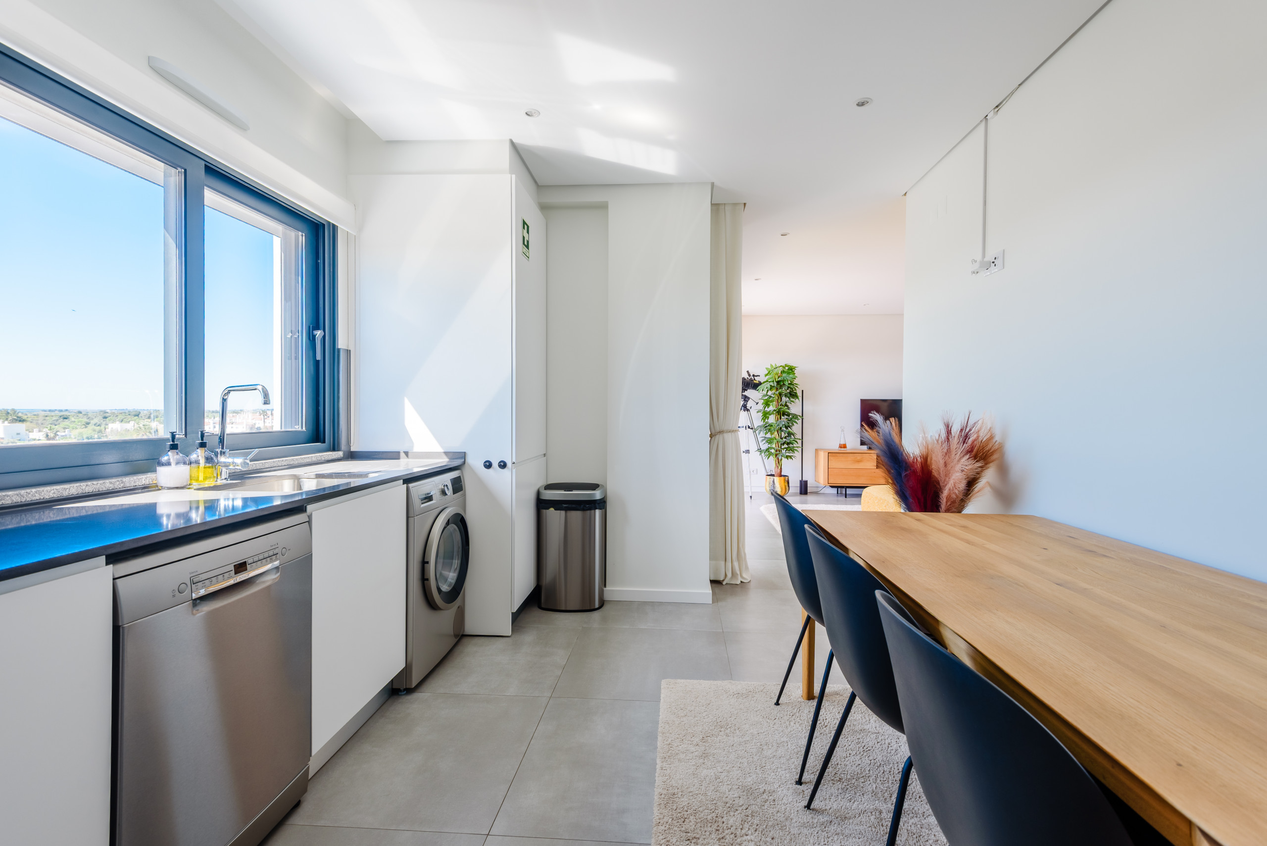 The fully equipped kitchen integrates seamlessly into the living area, making it ideal for relaxed stays, whether enjoying a quiet evening in or entertaining.