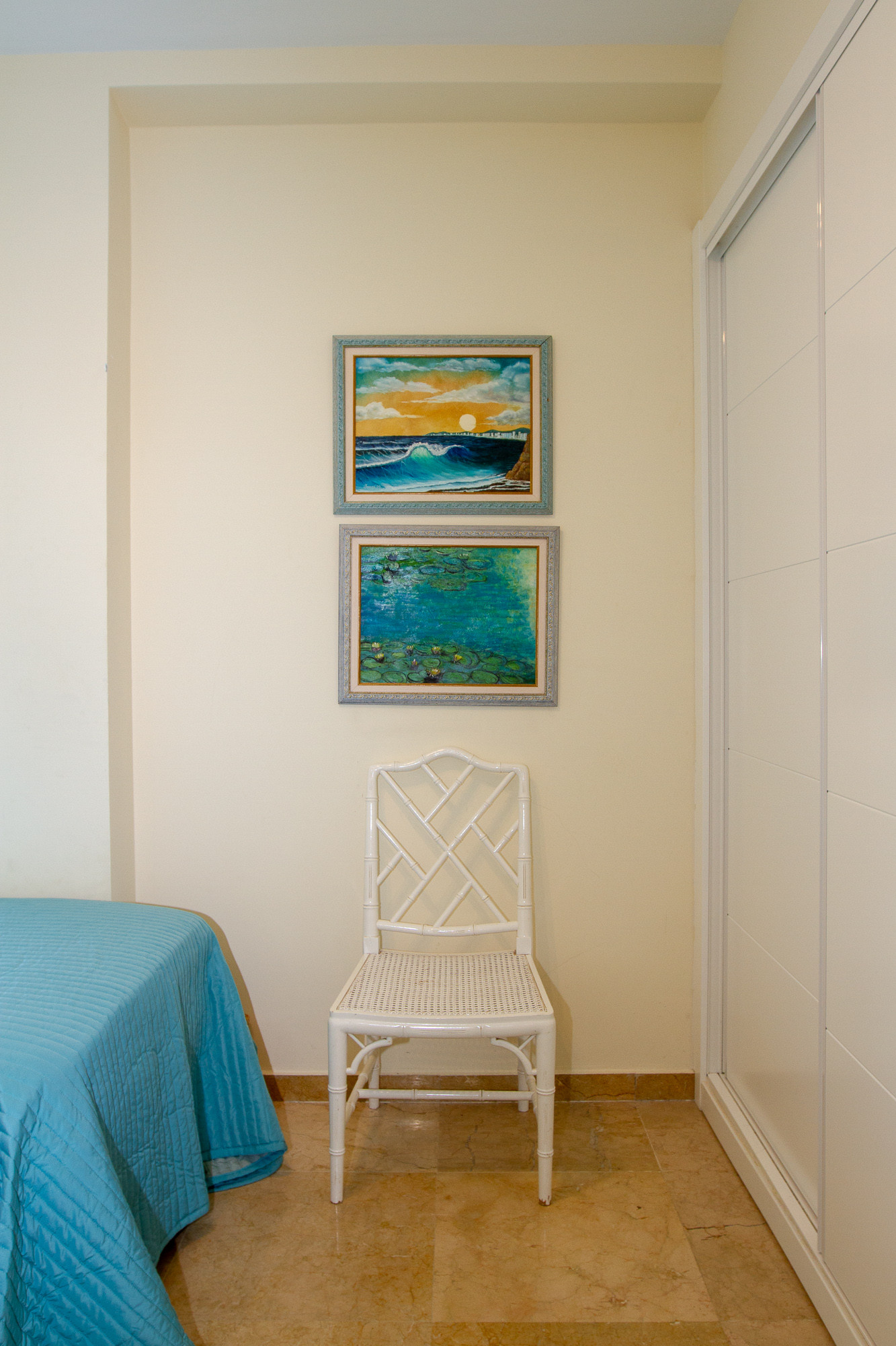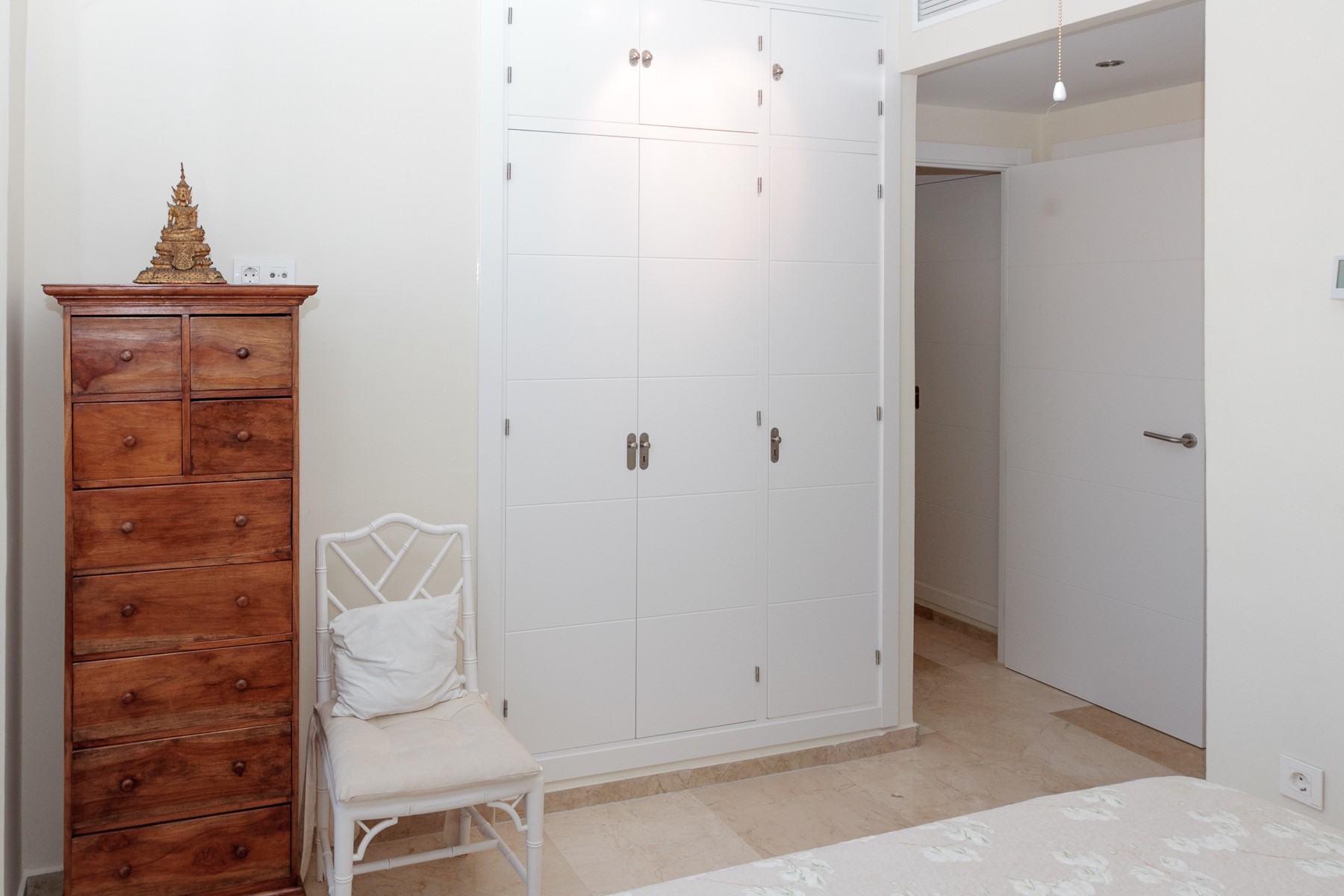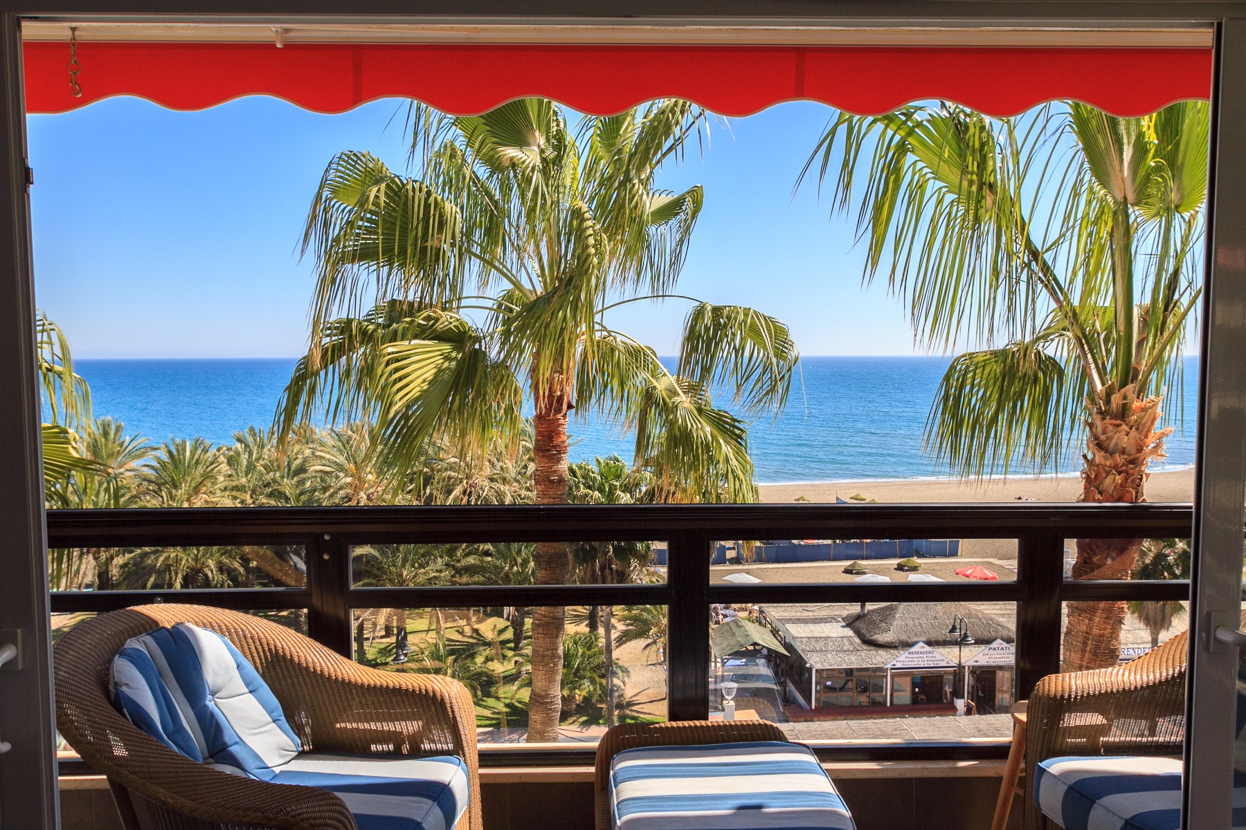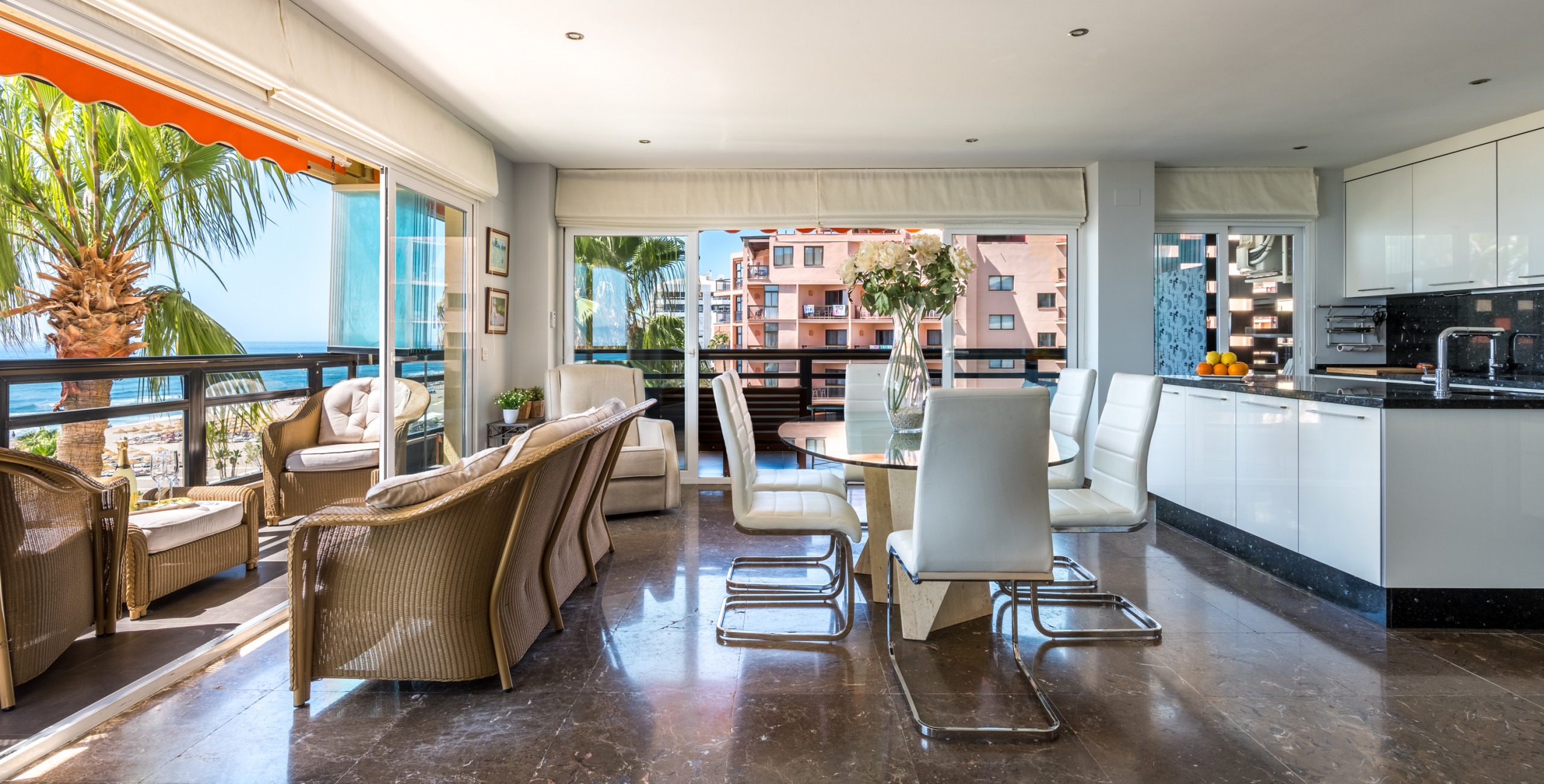 The apartment is on the 4th floor and there is of course an elevator. It is a corner apartment, which means that there is a possibility of the sun on one of the terraces throughout the day. You can start with a nice morning coffee on the east-facing terrace, which belongs to one bedroom and has a view of both the beach and to Malaga. The corner terrace is south-west facing and superbly furnished with chairs, tables and awnings.
