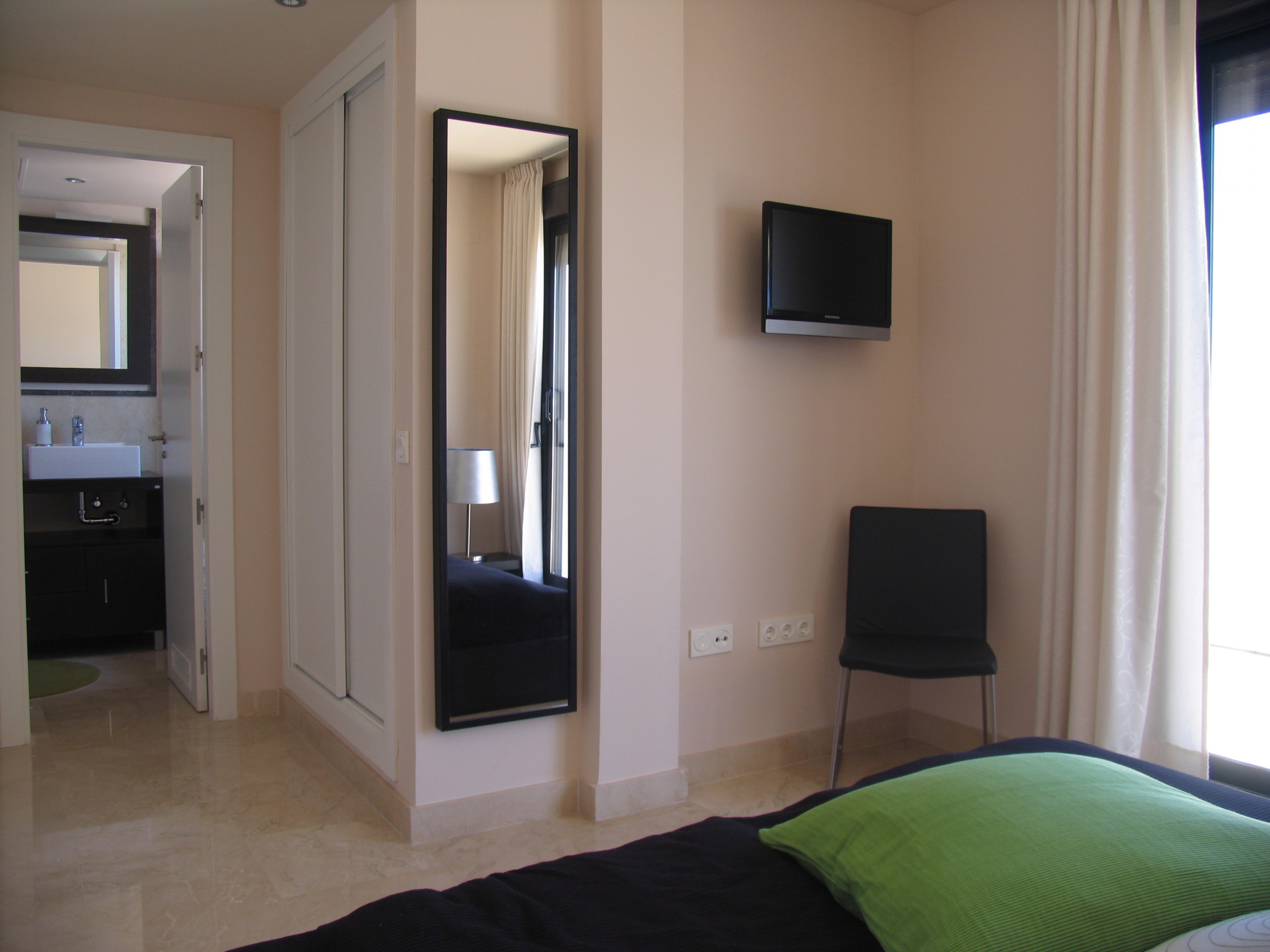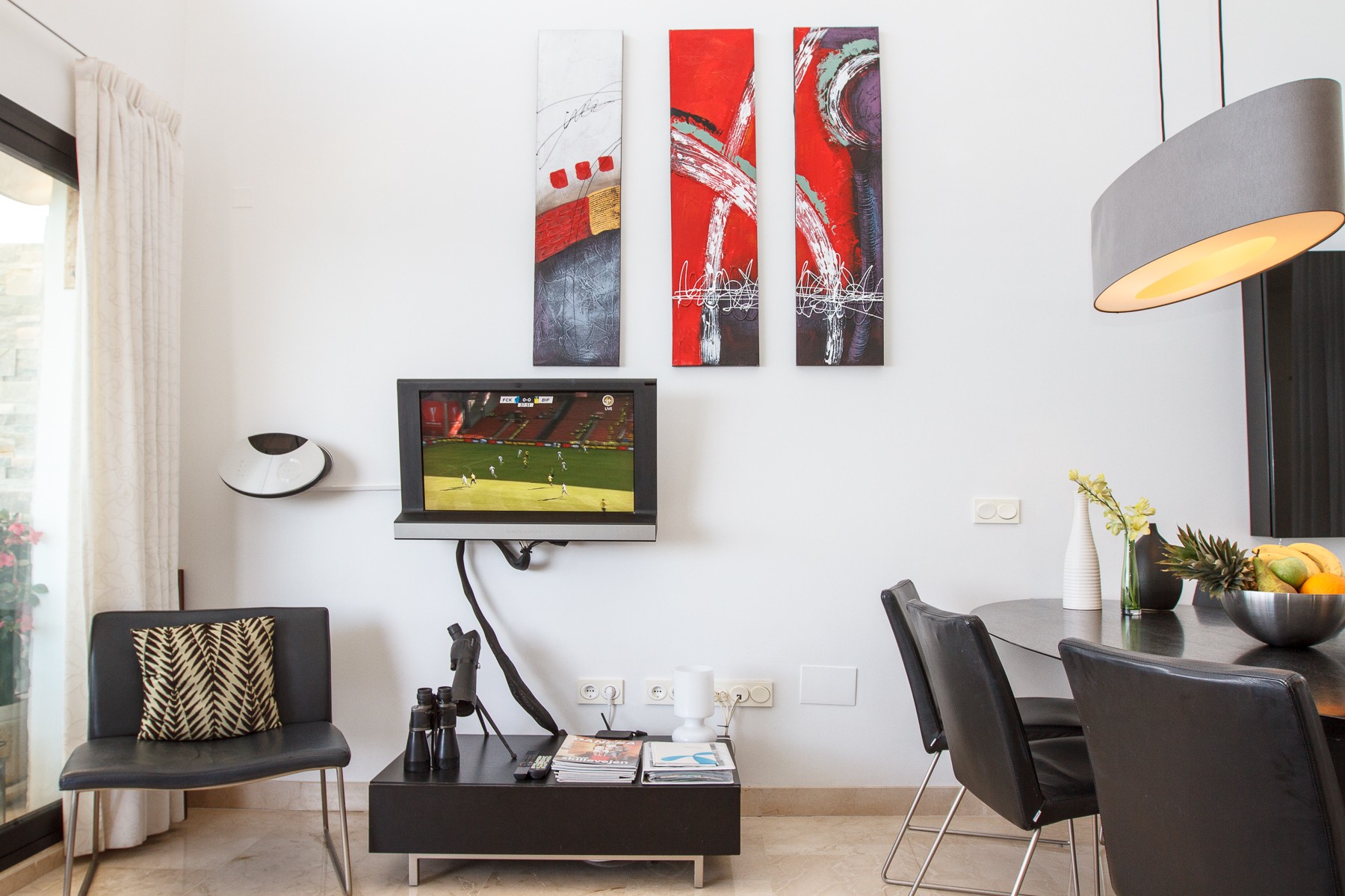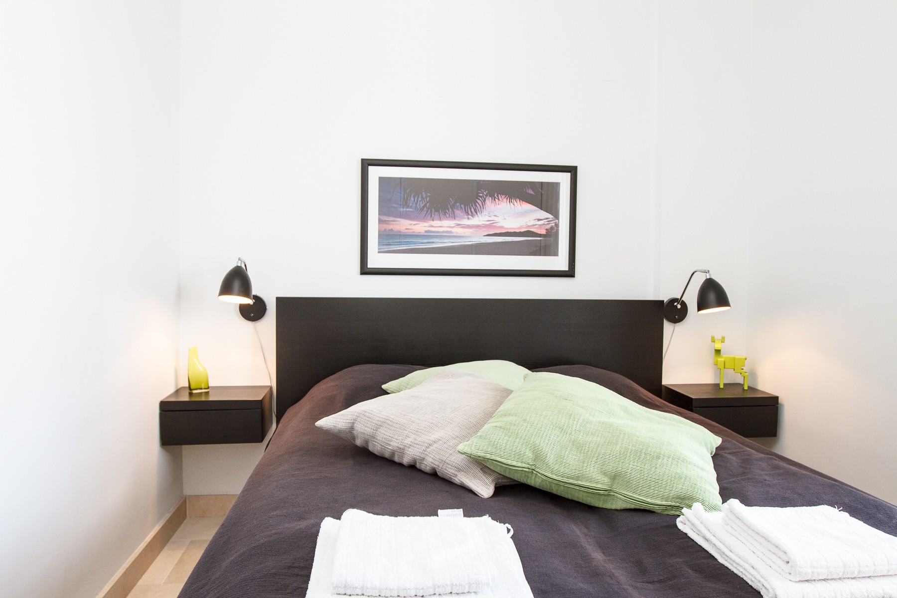 There is a nice living room with high ceilings and extra windows for nice and pleasant light. Comfortable sofa area with sofa bed for 2 extra beds and this gives a total of up to 8 sleeps.The fully equipped kitchen is in open plan with the living room and dining room. The lounge area includes flat screen, satellite TV, DVD, free wireless internet access and centrally controlled air conditioning. The whole apartment is modern and well equipped for an extra comfortable stay.