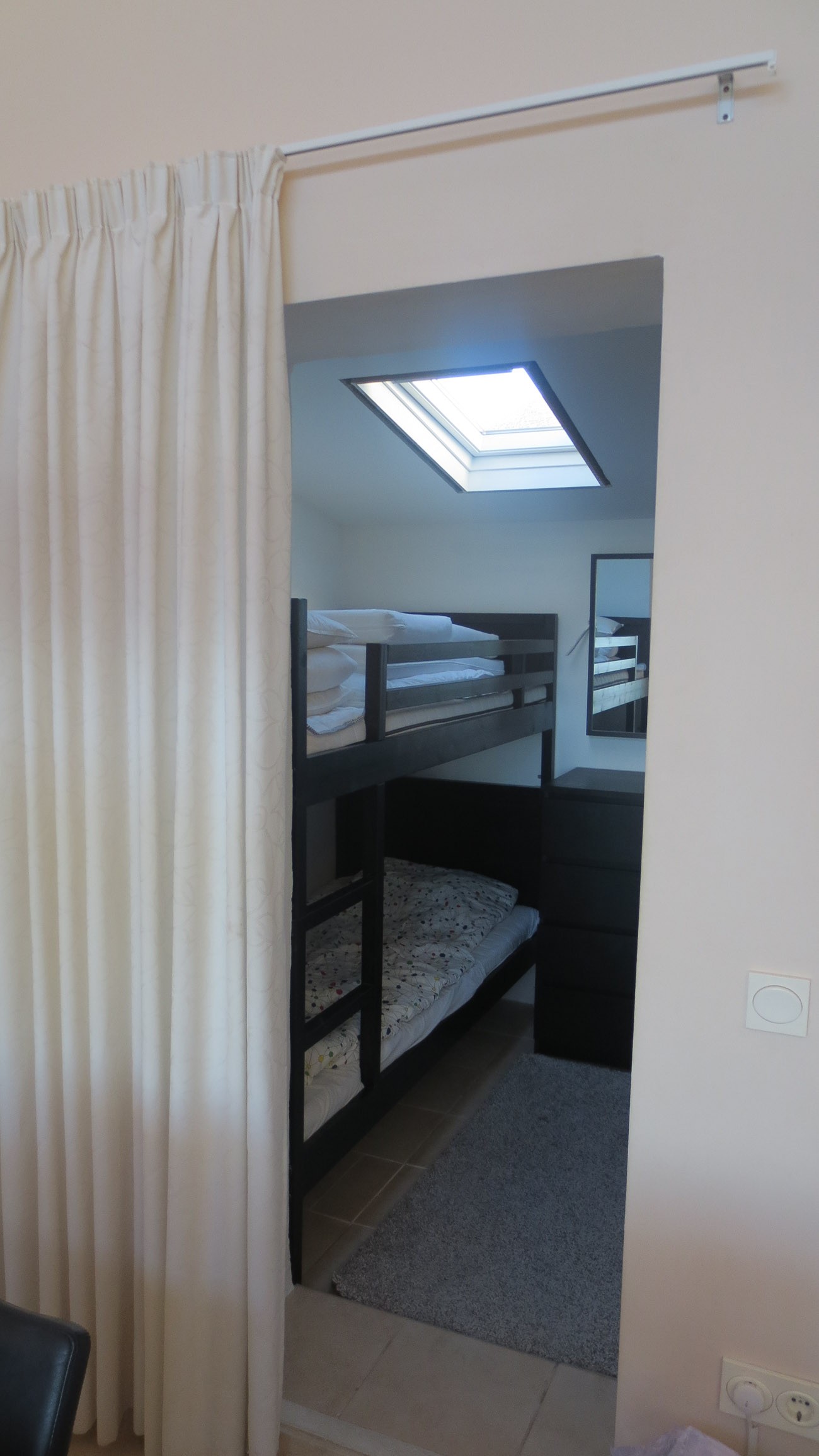 There are 2 bedrooms one of which is the master bedroom with TV and bath en suite. Both bedrooms contain a double bed, wardrobe, air conditioning and access to the terrace. There is a nice living room with high ceilings and extra windows for nice and pleasant light. There is also an extra room, which is separated from the living room by a curtain (no door). This room contains a bunk bed with 2 extra beds and dresser.