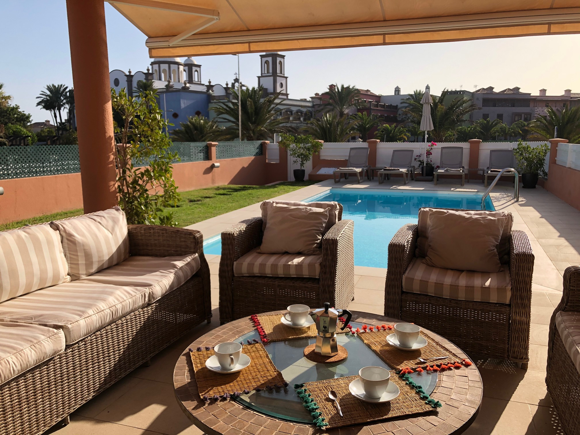 Wonderful two-storey holiday home in Meloneras with majestic garden with comfortable porch and private swimming pool with sunbeds area. Possibility of heating the pool with extra.
