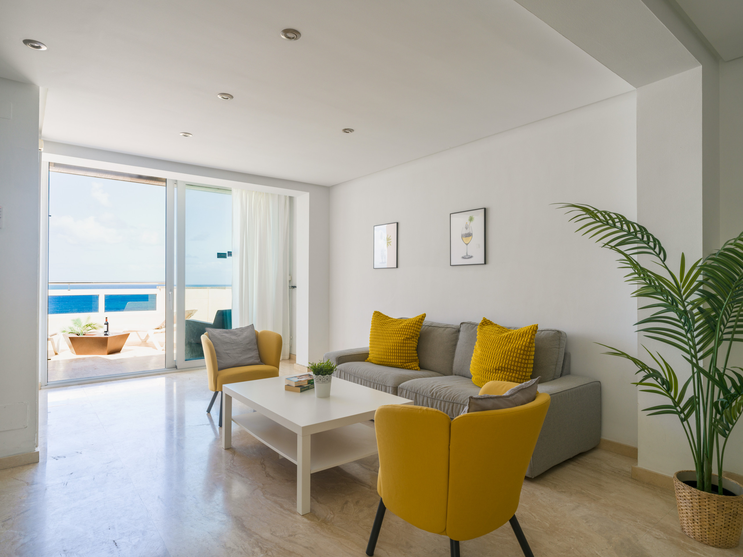 When you enter the building, you have to climb six steps to reach the lift, when you reach the top floor there are 14 steps to reach the fabulous penthouse. Upon entering, you will notice a bright living room with large windows that allow natural light to flood in. The neutral tones and contemporary décor create a welcoming and relaxing atmosphere. The dining room features a large dining table with six comfortable chairs, as well as comfortable sofas, a Smart TV and air conditioning, perfect for relaxing after a day of exploring the island,