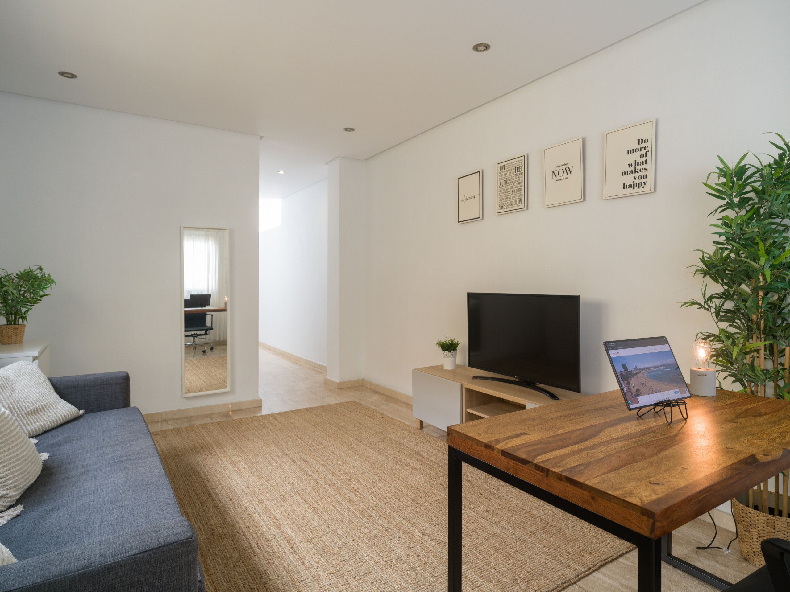 Between the two bedrooms there is a living room with a large and comfortable double sofa bed (1.50 metres) and Smart TV, which can be used as a third bedroom.