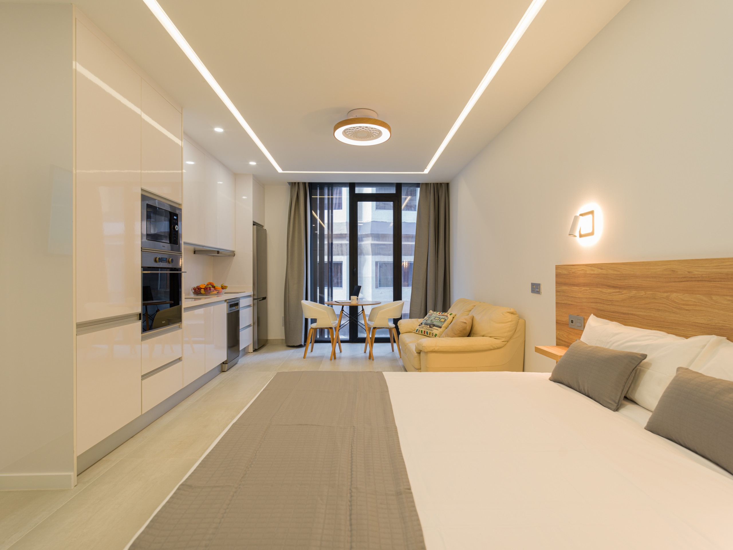 In the vitroceramic independent kitchen, refrigerator, microwave, oven, freezer, dryer, dishwasher, dishes/cutlery, kitchen utensils, coffee machine, toaster and kettle are provided.