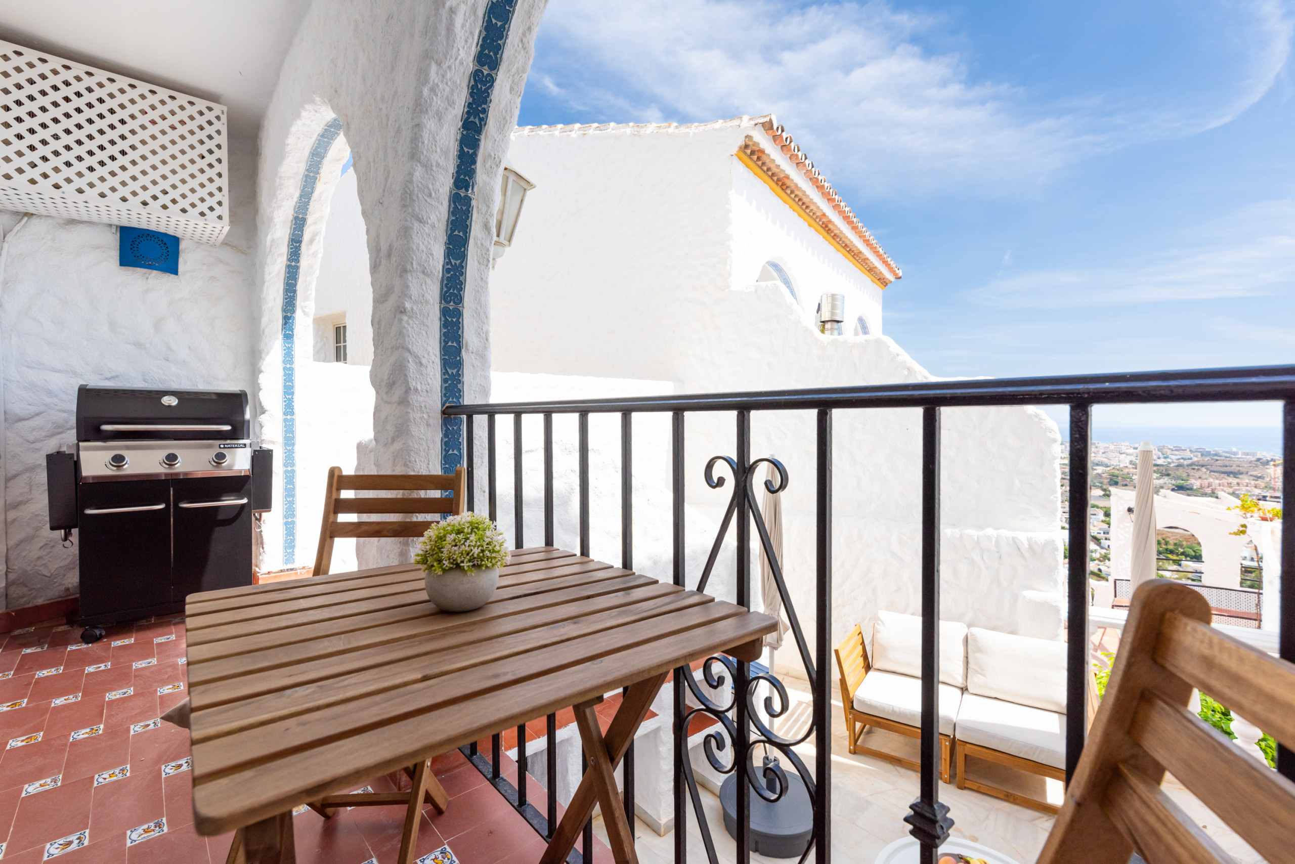 Nestled in the charming white village of Benalmádena Pueblo, just 22 km from Málaga Airport, Casa de la Buena Vida is a stylish and spacious 3-bedroom townhouse designed for families, friends or couples looking for a peaceful escape with stunning sea views. Spanning 120 m² over two floors, this elegant retreat blends modern Scandinavian décor with the warmth and soul of Andalusia.