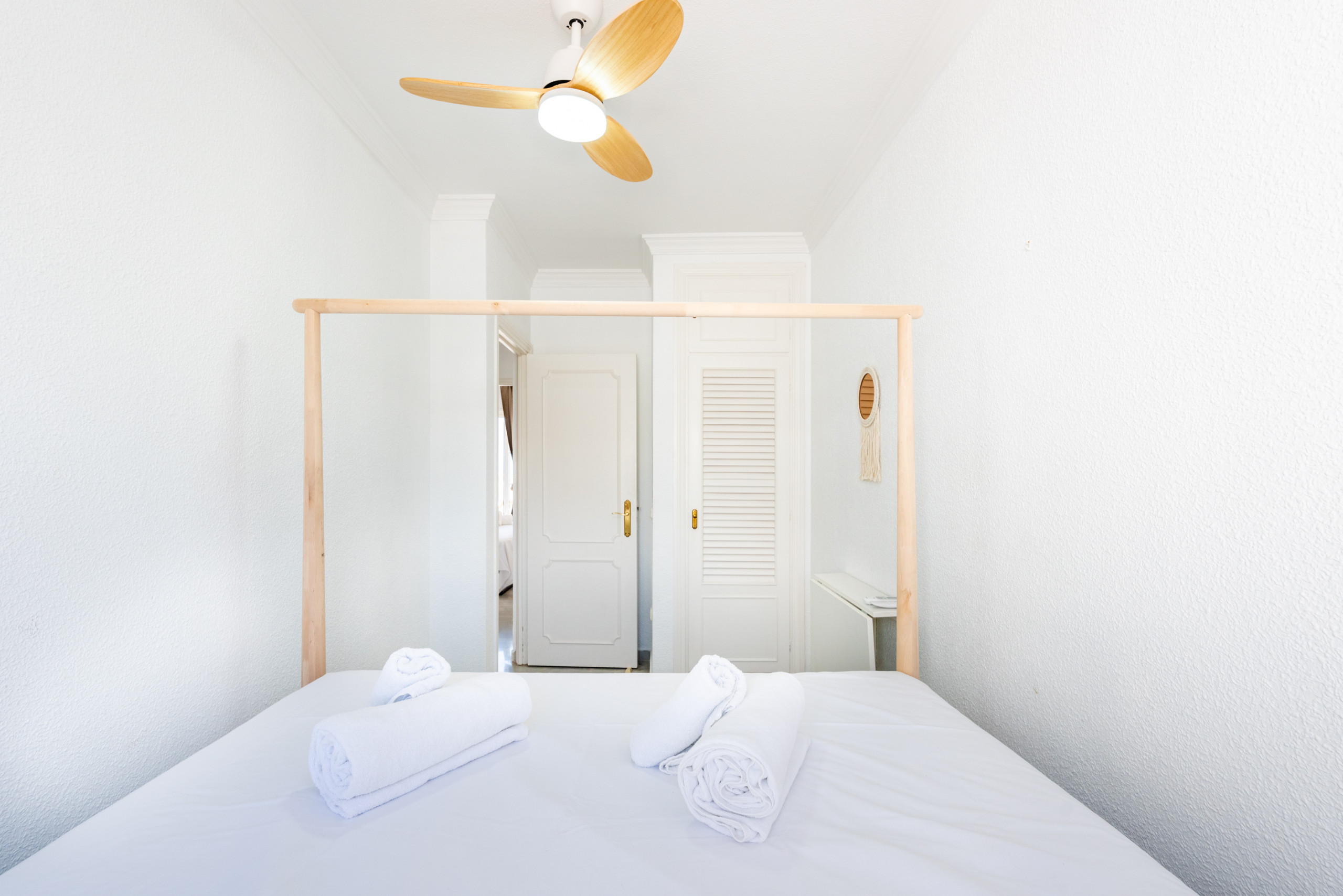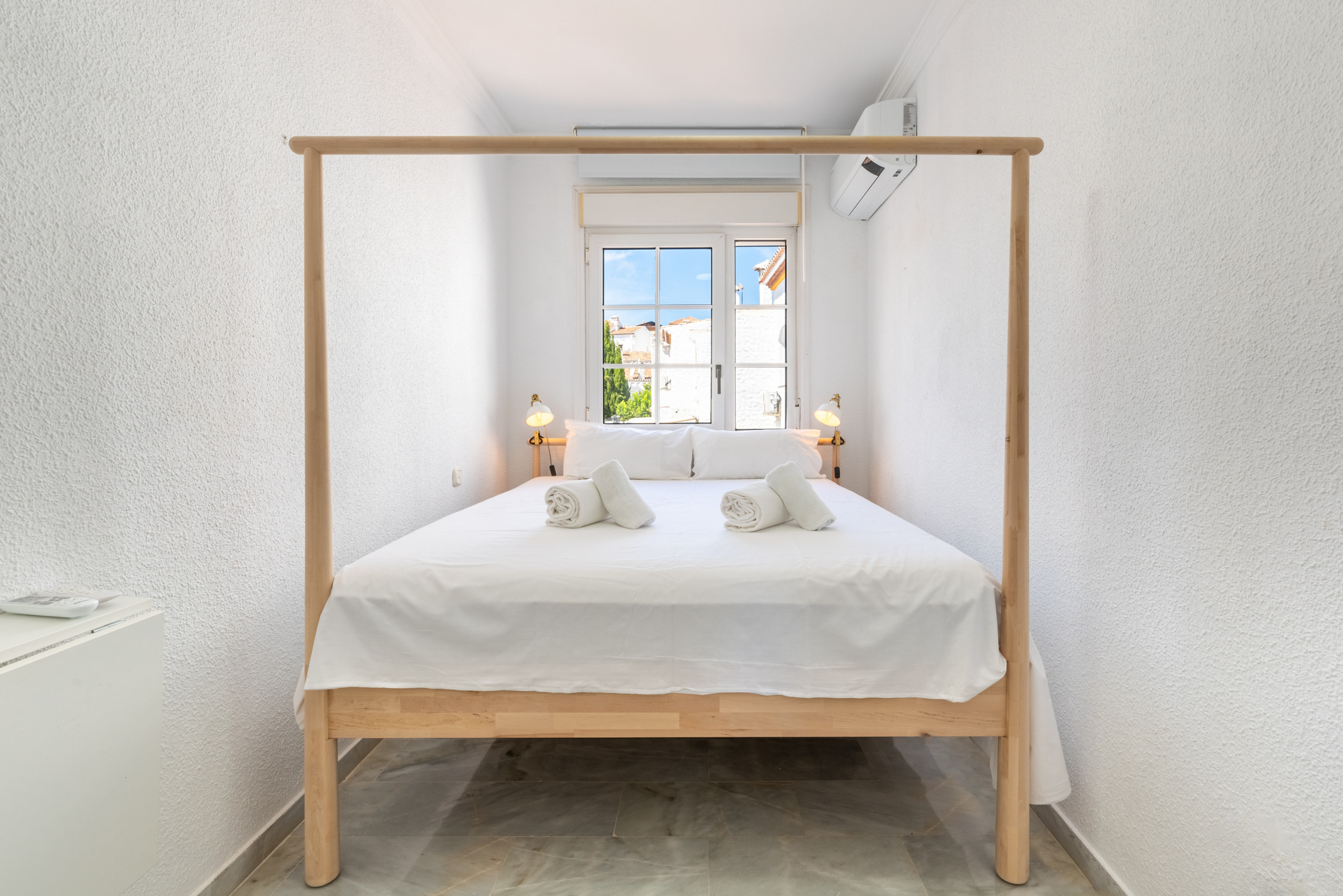Third bedroom with queen-size bed (160x200) and natural light, overlooking the white village below