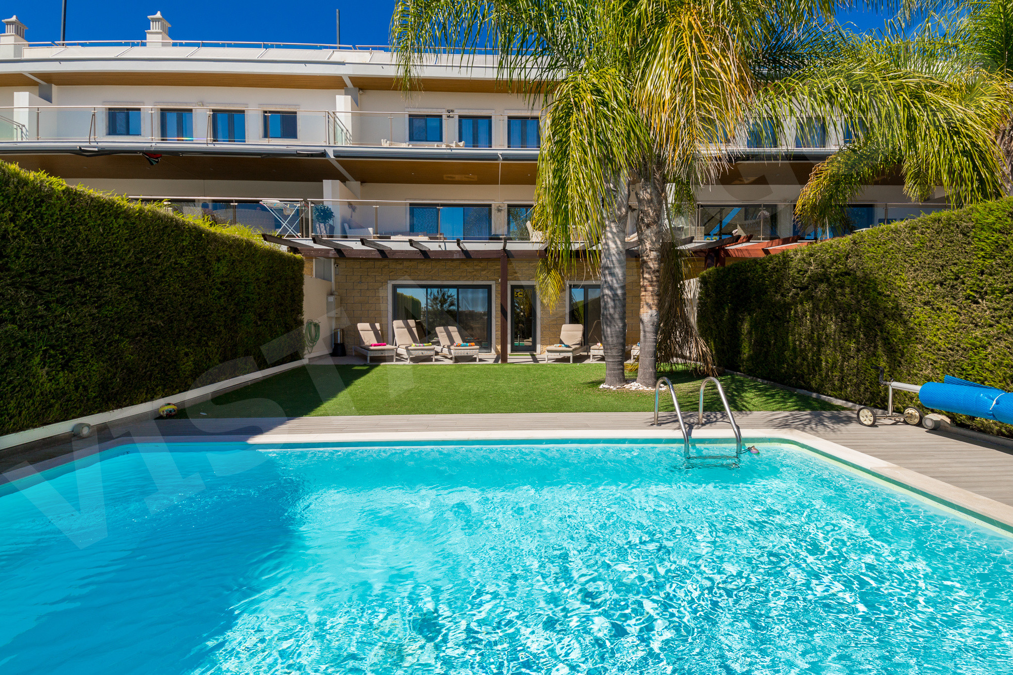 The private swimming pool is surrounded by a beautifully landscaped garden, providing a tranquil spot for sunbathing, swimming, and quality family time. The terraces and balconies offer plenty of space to enjoy the Algarve’s sunshine or dine under the stars.