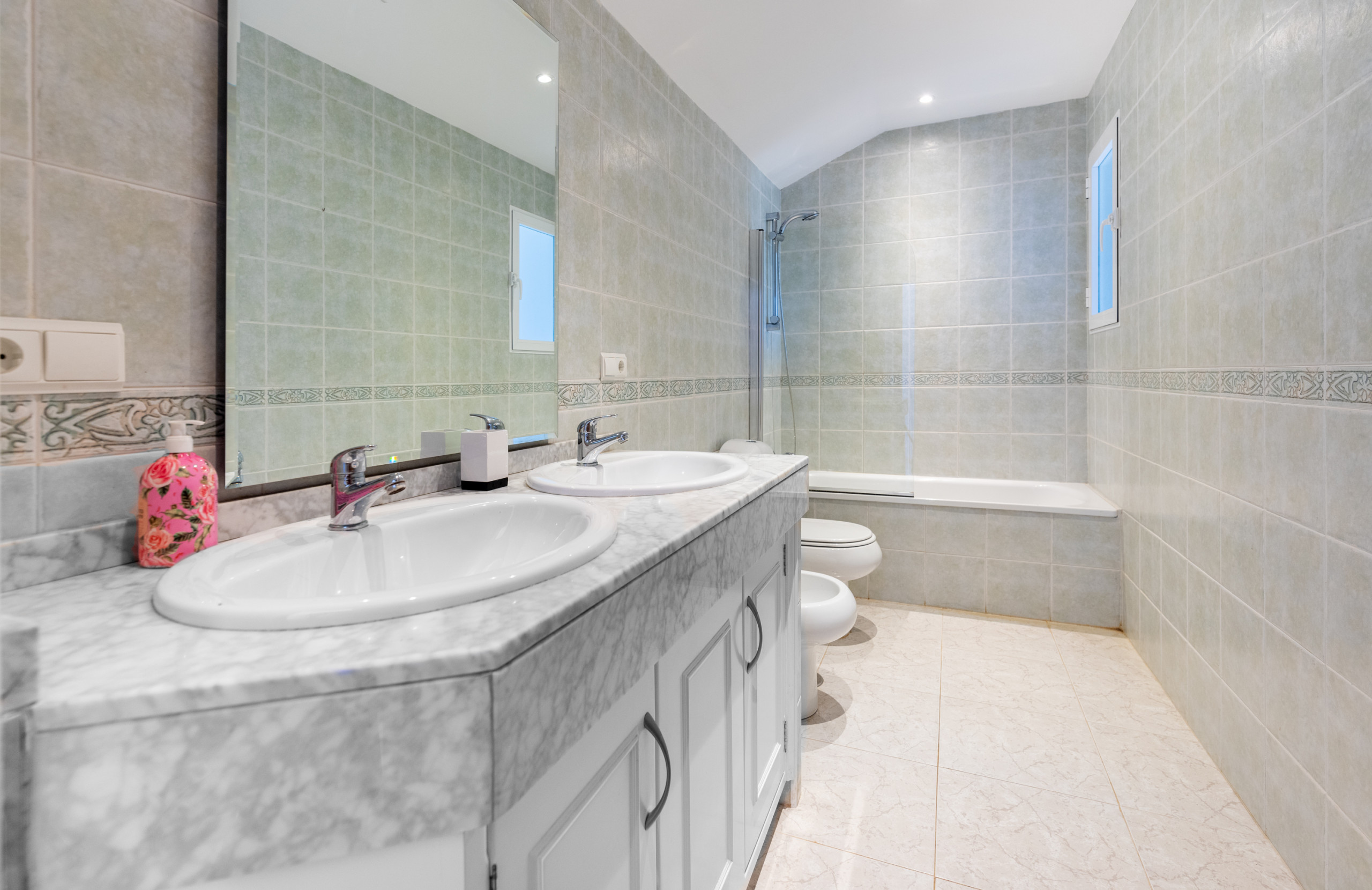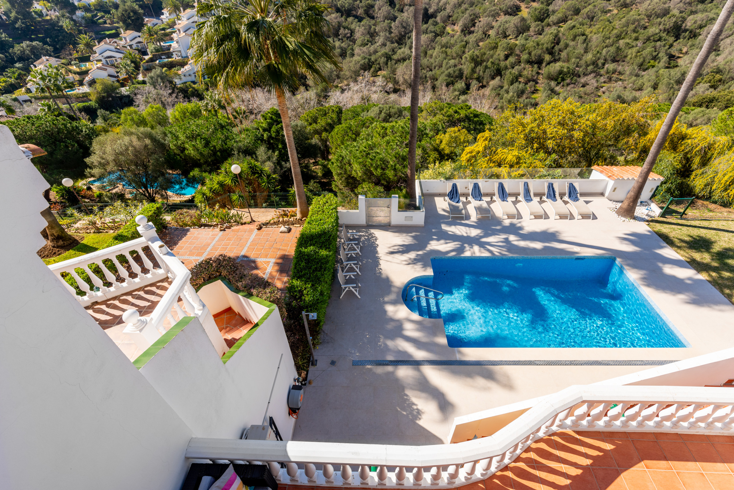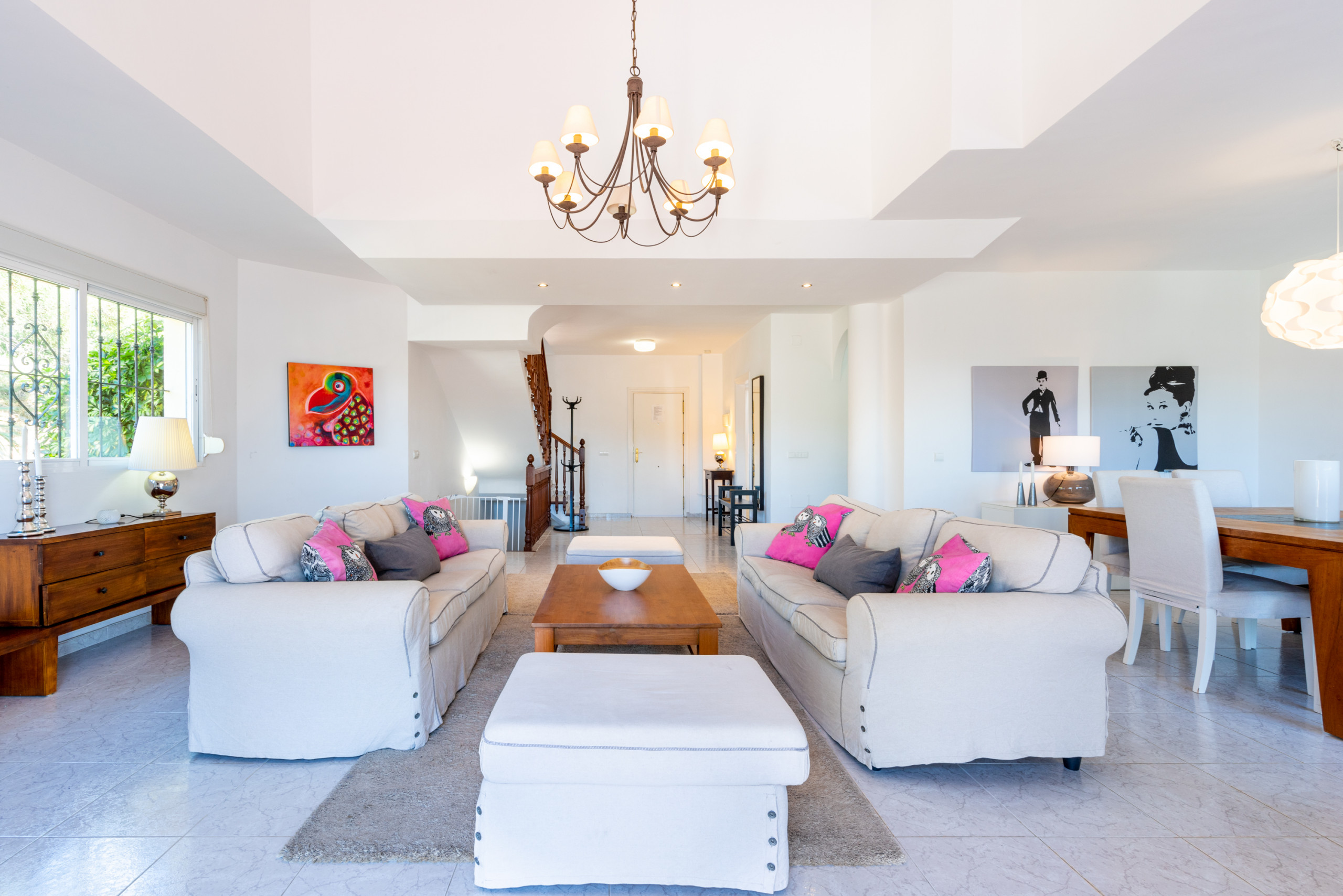 Once you enter in this lovely home, you will find a small reception space that leads to the great living room. In this exclusive living room, you will enjoy a dining area with seating for up to 6 people, and two comfortable sofas where you and your family can watch tv. From the living room you can access the terrace which is furnished with 2 sofas and an outdoor table. Following his terrace you will access the private swimming pool, a perfect place to relax and enjoy the sunny days of Malaga. There are 3 outdoor chairs and 6 sun loungers available.