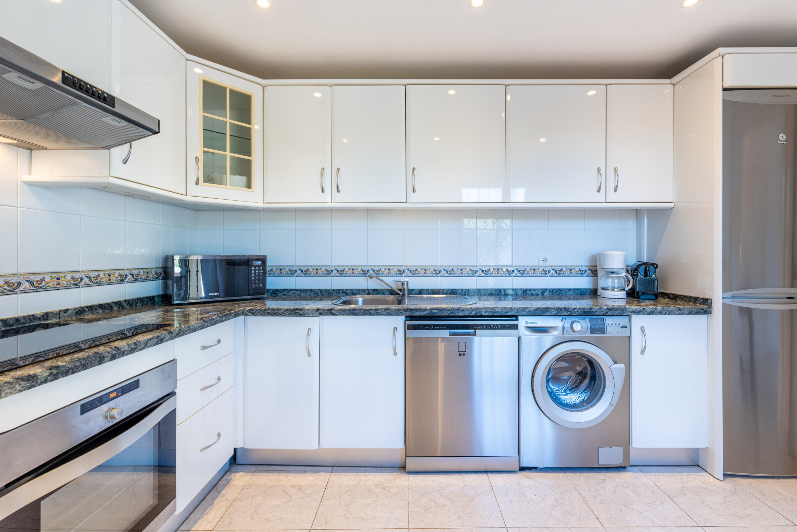 Back at the property, the separated kitchen is located at the entrance, and it is fully equipped with all the amenities needed for a family holidays like dishwasher, laundry machine, oven, microwave…
