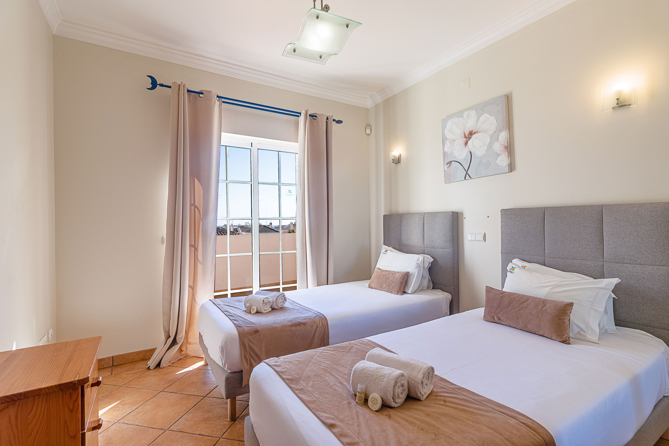 Step inside to four bedrooms with twin beds and three full bathrooms, giving everyone plenty of space and flexibility. On the ground floor, there is a bedroom with two single beds and a bathroom with a bathtub, plus a convenient guest WC. Upstairs, you will find three further twin bedrooms: one with a bathroom with bathtub, one with a bathroom with shower and one sharing those facilities, making it easy for families to organise their daily routines.