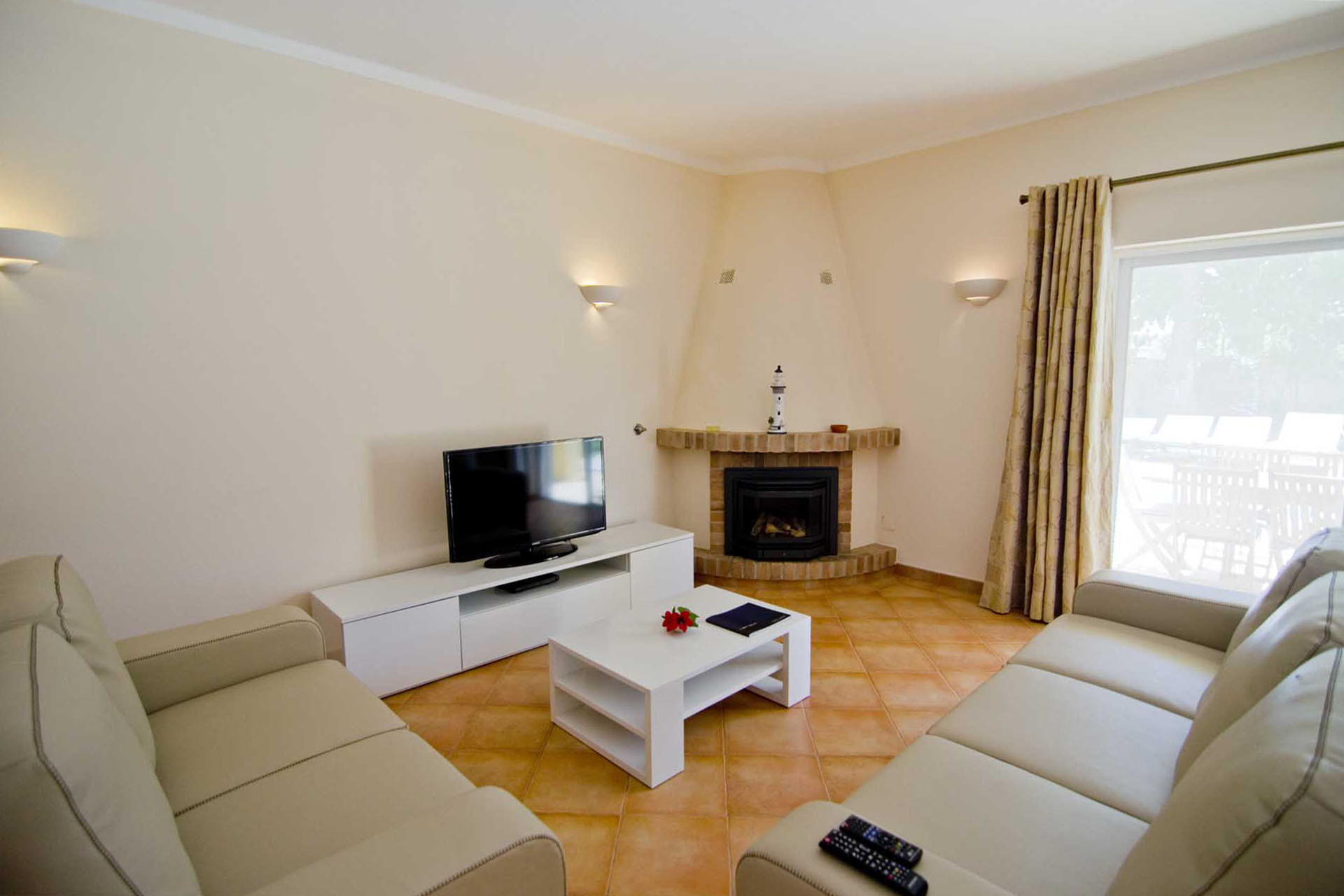 The living room is spacious, it has one table with 8 seats and another with 6 other places. For temperature control, there is a fireplace and air conditioning.