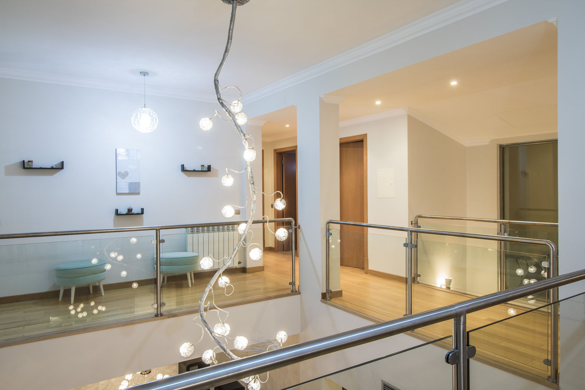 The living room is spacious and bright, its open structure with high ceiling allows you to view the corridors of the first floor, a situation that gives it elegance and some eccentricity. The fireplace makes the space more welcoming on winter days.