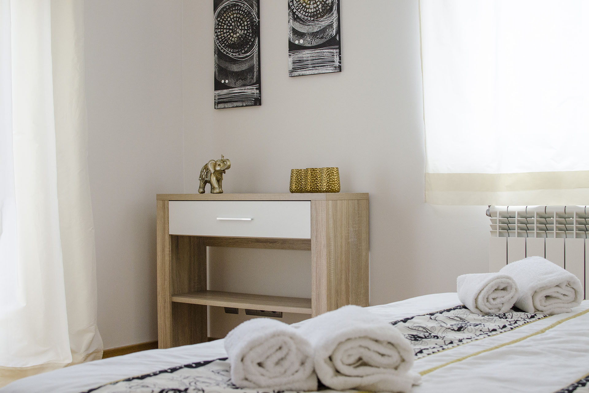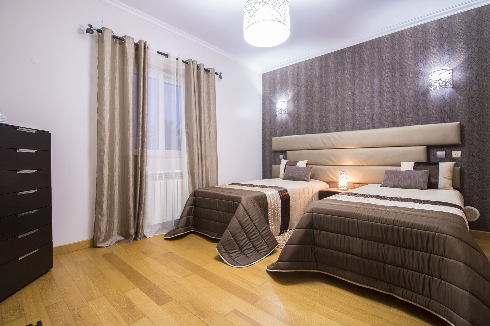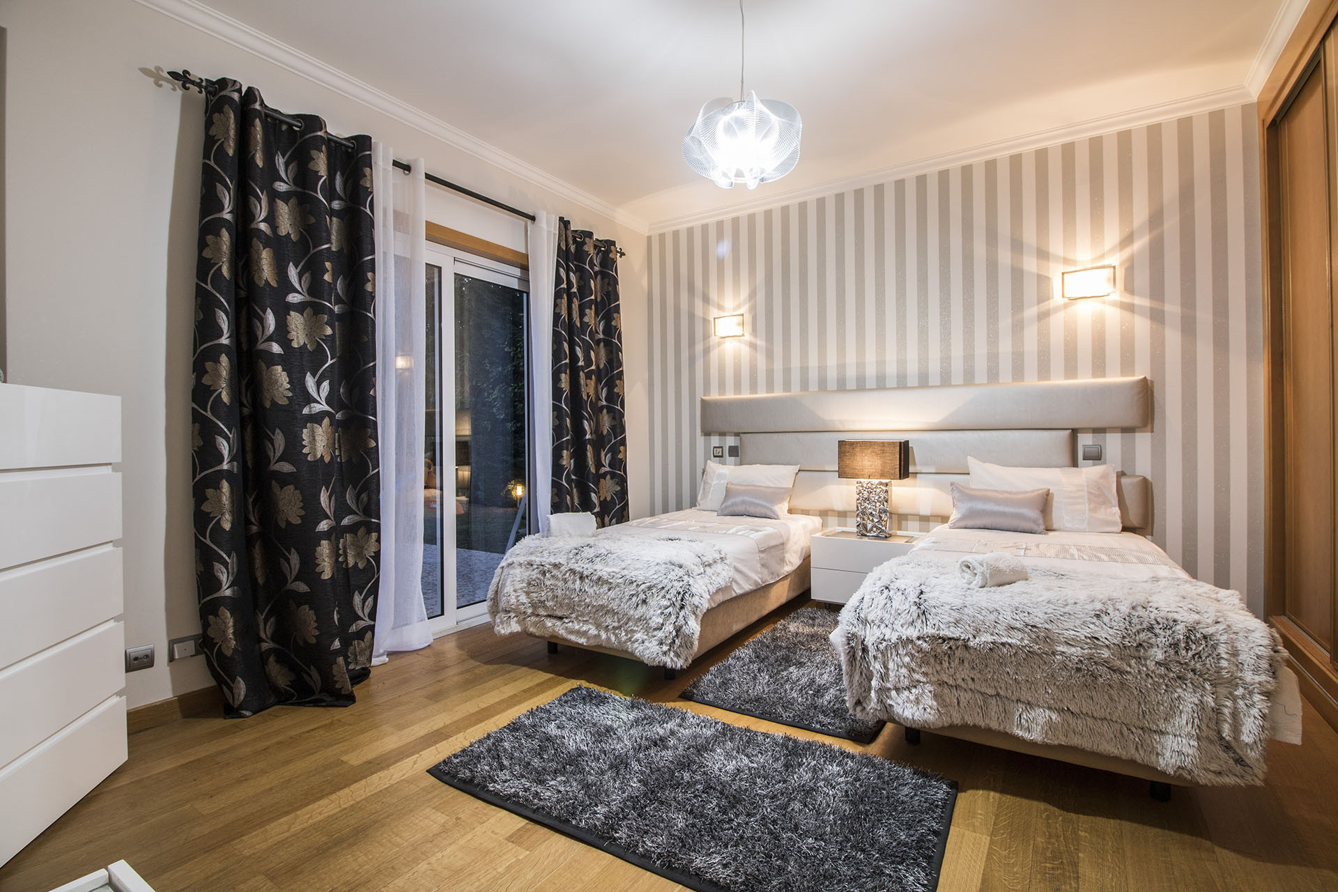 On the ground floor, there are 2 bedrooms. 1 double bedroom and 1 room with 2 single beds, both decorated in pleasant white, grey, and black tones, in a modern and comfortable style. The double bedroom's bathroom is spacious and has a bathtub, the single room's bathroom offers a shower with a hydromassage column.